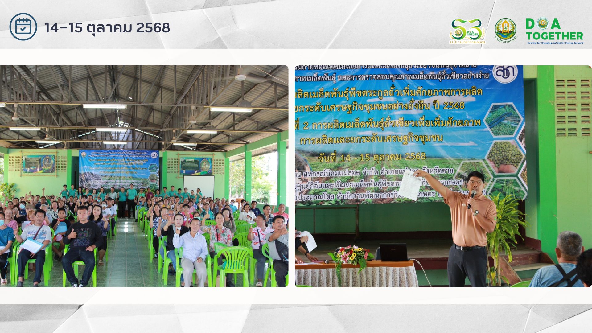 วันที่ 14-15 ตุลาคม 2568 นายชูชาติ บุญศักดิ์ ผู้อำนวยการศูนย์วิจัยและพัฒนาเมล็ดพันธุ์พืชลพบุรี และเจ้าหน้าที่ศูนย์ฯ จัดฝึกอบรมถ่ายทอดเทคโนโลยีการผลิตเมล็ดพันธุ์ถั่วเขียวชั้นพันธุ์จำหน่าย การปรับปรุงสภาพเมล็ดพันธุ์และการตรวจสอบคุณภาพเมล็ดพันธุ์ถั่วเขียวอย่างง่าย โครงการ : ผลิตเมล็ดพันธุ์พืชตระกูลถั่วเพื่อเพิ่มศักยภาพการผลิตและยกระดับเศรษฐกิจชุมชนอย่างยั่งยืน ปี 2568 กิจกรรมที่ 2 : การผลิตเมล็ดพันธุ์ถั่วเขียวเพื่อเพิ่มศักยภาพการผลิตและยกระดับเศรษฐกิจชุมชน กิจกรรมดังกล่าวมีวัตถุประสงค์เพื่อถ่ายทอดเทคโนโลยีจากงานวิจัยพร้อมใช้ในการผลิตเมล็ดพันธุ์ถั่วเขียวสู่เกษตรกร โดยมี นางสาวปวีณา ไชยวรรณ์ นักวิชาการเกษตรชำนาญการพิเศษ และเจ้าหน้าที่ศูนย์ฯ ศูนย์วิจัยพืชไร่ชัยนาท ร่วมเป็นวิทยากรบรรยายให้ความรู้แก่เกษตรผู้เข้าร่วมอบรม จำนวน400ราย และได้รับเกียรติจากหัวหน้าโครงการฯ นางสาวเชาวนาถ พฤทธิเทพ ผู้เชี่ยวชาญด้านพืชไร่ตระกูลถั่ว จากสถาบันวิจัยพืชไร่และพืชทดแทนพลังงาน เป็นประธานในพิธี ณ สหกรณ์นิคมแม่สอด จำกัด อำเภอแม่สอด จังหวัอตาก