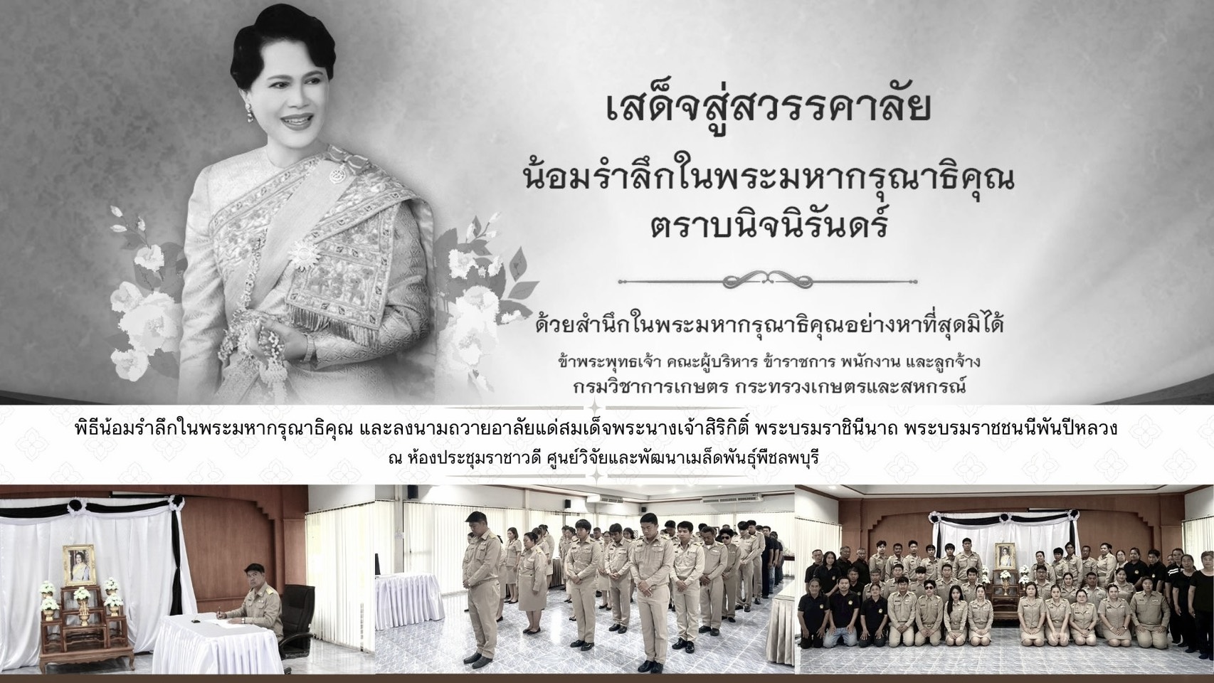 นายชูชาติบุญศักดิ์ ผู้อำนวยการศูนย์วิจัยและพัฒนาเมล็ดพันธุ์พืชลพบุรี พร้อมด้วยข้าราชการ พนักงานราชการและบุคลากรศูนย์วิจัยและพัฒนาเมล็ดพันธุ์พืชลพบุรี ร่วมลงนามถวายอาลัย เบื้องหน้าพระฉายาลักษณ์สมเด็จพระนางเจ้าสิริกิติ์ พระบรมราชินีนาถ พระบรมราชชนนีพันปีหลวง ณ ห้องประชุมราชาวดี ศูนย์วิจัยและพัฒนาเมล็ดพันธุ์พืชลพบุรี