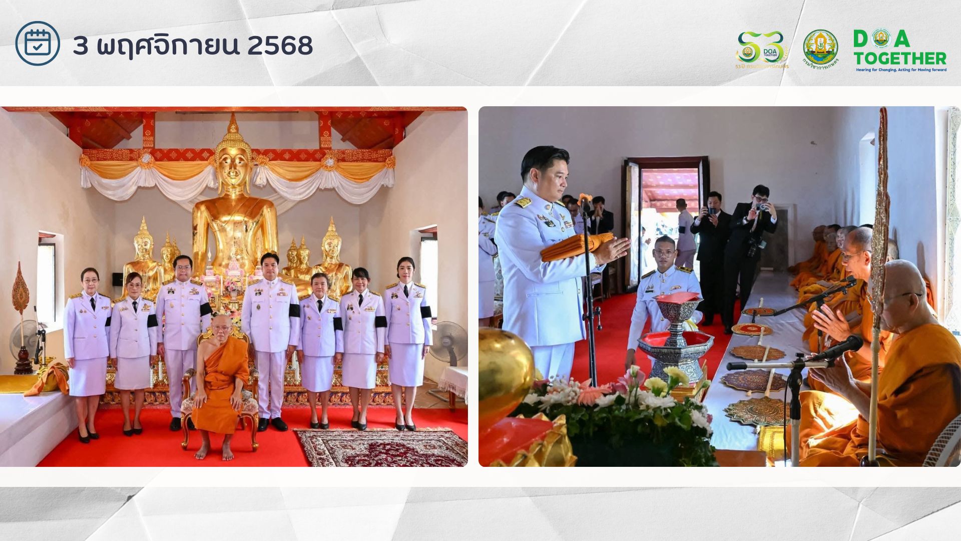 วันที่ 3 พฤศจิกายน 2568 นายรพีภัทร์ จันทรศรีวงศ์ อธิบดีกรมวิชาการเกษตร เป็นประธานในพิธีถวายผ้าพระกฐินพระราชทาน กรมวิชาการเกษตร ประจำปี 2568 และถวายจตุปัจจัยเพื่อถวายเป็นพระราชกุศลในการทำนุบำรุงพระพุทธศาสนาและบำรุงพระอาราม โดยมีนางวิลาวัณย์ ใคร่ครวญ รองอธิบดีกรมวิชาการเกษตร คณะผู้บริหาร ข้าราชการ และเจ้าหน้าที่กรมวิชาการเกษตร ตลอดจนประชาชนผู้มีจิตศรัทธาเข้าร่วมในพิธี โดยมียอดเงินร่วมทำบุญจำนวนทั้งสิ้น 3,555,555 บาท 55 สตางค์
