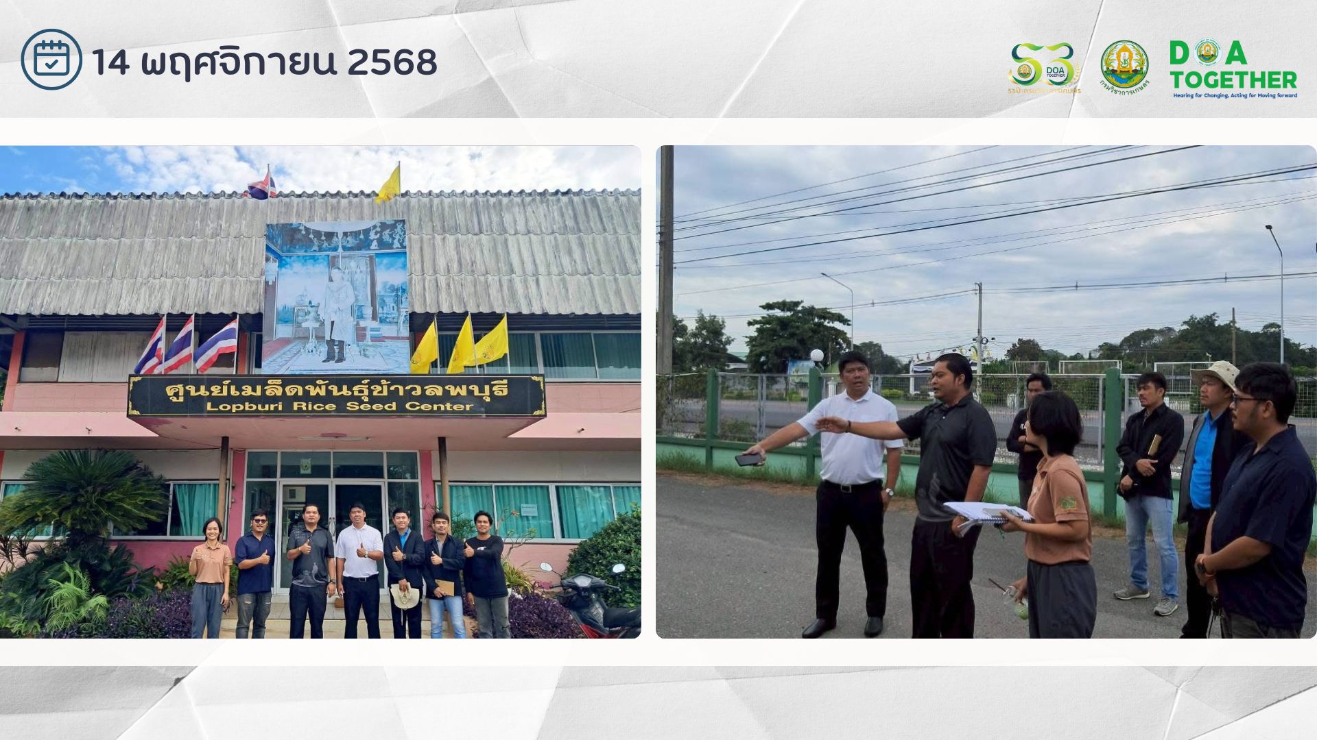 วันที่ 14 พฤศจิกายน 2568 นายชูชาติ บุญศักดิ์ ผู้อำนวยการศูนย์วิจัยและพัฒนาเมล็ดพันธุ์พืชลพบุรี พร้อมด้วยเจ้าหน้าที่ เข้าร่วมศึกษาดูงานการปรับปรุงสภาพเมล็ดพันธุ์ข้าว ของศูนย์เมล็ดพันธุ์ข้าวลพบุรี ซึ่งมีแผนการผลิตมากกว่า 2,000 ตัน/ปี และมีการใช้หุ่นยนต์ในกระบวนการทำงาน เพื่อเป็นข้อมูลความรู้และนำมาประยุกต์ใช้กับการปรับปรุงสภาพเมล็ดพันธุ์พืชไร่ของศูนย์ฯ โดยมีนายสันติชัย หัตถ์ฐาปนวัฒน์ นักวิชาการเกษตรชำนาญการพิเศษ รักษาการในตำแหน่งผู้อำนวยการศูนย์เมล็ดพันธุ์ข้าวลพบุรี และเจ้าหน้าที่ศูนย์ฯ เป็นผู้ให้ข้อมูลความรู้ ณ ศูนย์เมล็ดพันธุ์ข้าวลพบุรี ตำบลโคกตูม อำเภอเมืองลพบุรี จังหวัดลพบุรี