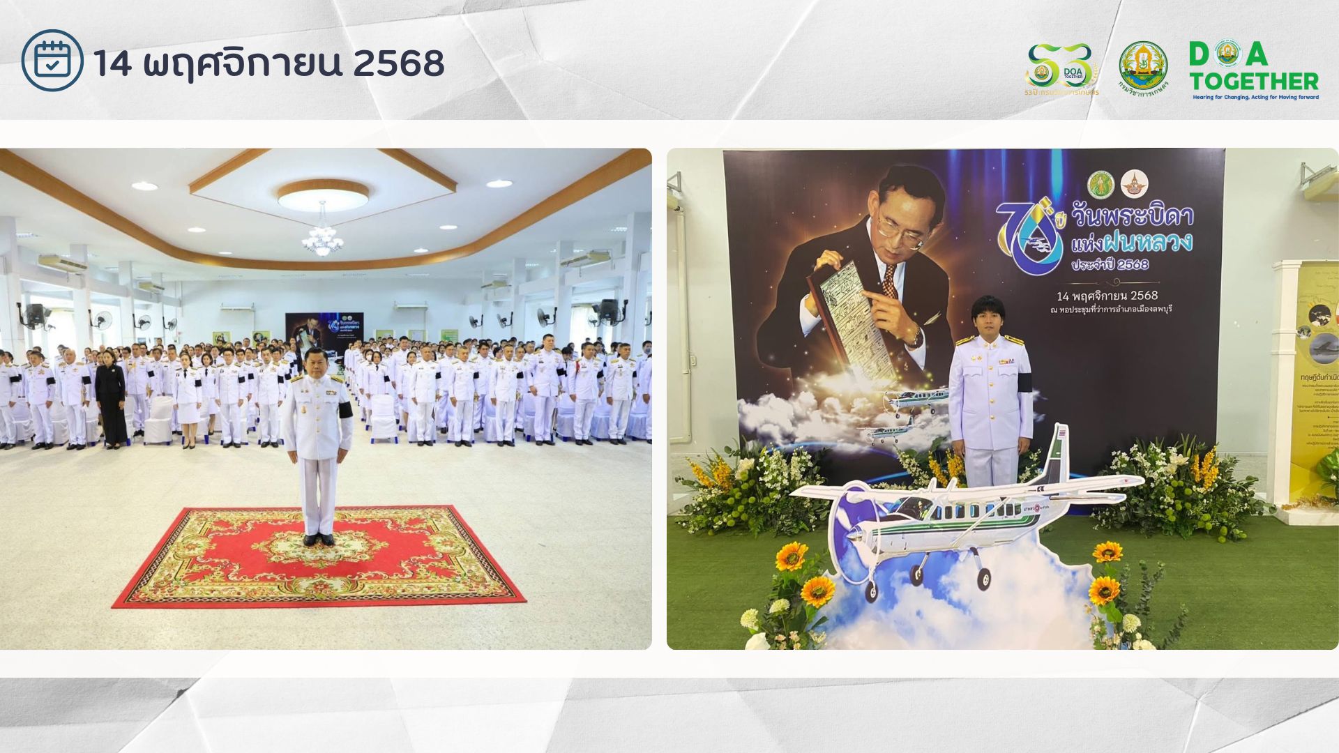 วันศุกร์ที่ 14 พฤศจิกายน 2568 นายชูชาติ บุญศักดิ์ ผู้อำนวยการศูนย์วิจัยและพัฒนาเมล็ดพันธุ์พืชลพบุรี มอบหมายให้ ว่าที่ร้อยตรี แทนไท กล่อมจินดา นักวิชาการเกษตรปฏิบัติการ เข้าร่วมพิธีถวายราชสักการะน้อมรำลึกในพระมหากรุณาธิคุณพระบาทสมเด็จพระบรมชนกาธิเบศร มหาภูมิพลอดุยเดชมหาราช บรมนาถบพิตร เนื่องในวันพระบิดาแห่งฝนหลวง ประจำปี 2568 ณ หอประชุมอำเภอเมืองลพบุรี จังหวัดลพบุรี โดยนายปรัญญา เปปะตัง รองผู้ว่าราชการจังหวัดลพบุรี รักษาราชการแทนผู้ว่าราชการจังหวัดลพบุรี เป็นประธานในพิธีวางพานพุ่มดอกไม้สดถวายราชสักการะเบื้องหน้าพระบรมฉายาลักษณ์พระบาทสมเด็จพระบรมชนกาธิเบศร มหาภูมิพลอดุลยเดชมหาราช บรมนาถบพิตร และกล่าวรำลึกถึงพระมหากรุณาธิคุณที่ทรงมีต่อประเทศชาติและประชาชน