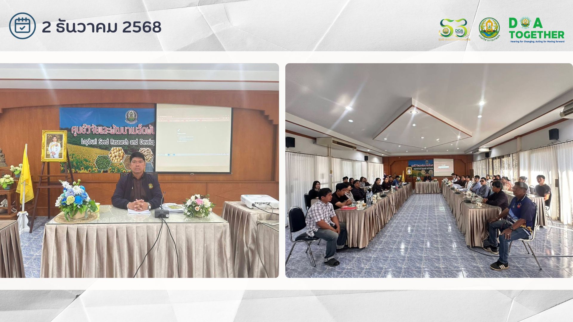 วันที่ 2 ธันวาคม 2568 นายชูชาติ บุญศักดิ์ ผู้อำนวยการศูนย์วิจัยและพัฒนาเมล็ดพันธุ์พืชลพบุรี พร้อมด้วยข้าราชการพนักงานราชการ เข้าร่วมการประชุมศูนย์วิจัยและพัฒนาเมล็ดพันธ์พืชลพบุรี ครั้งที่ 4/2568 ณ ห้องประชุมราชาวดี ศูนย์วิจัยและพัฒนาเมล็ดพันธุ์พืชลพบุรี