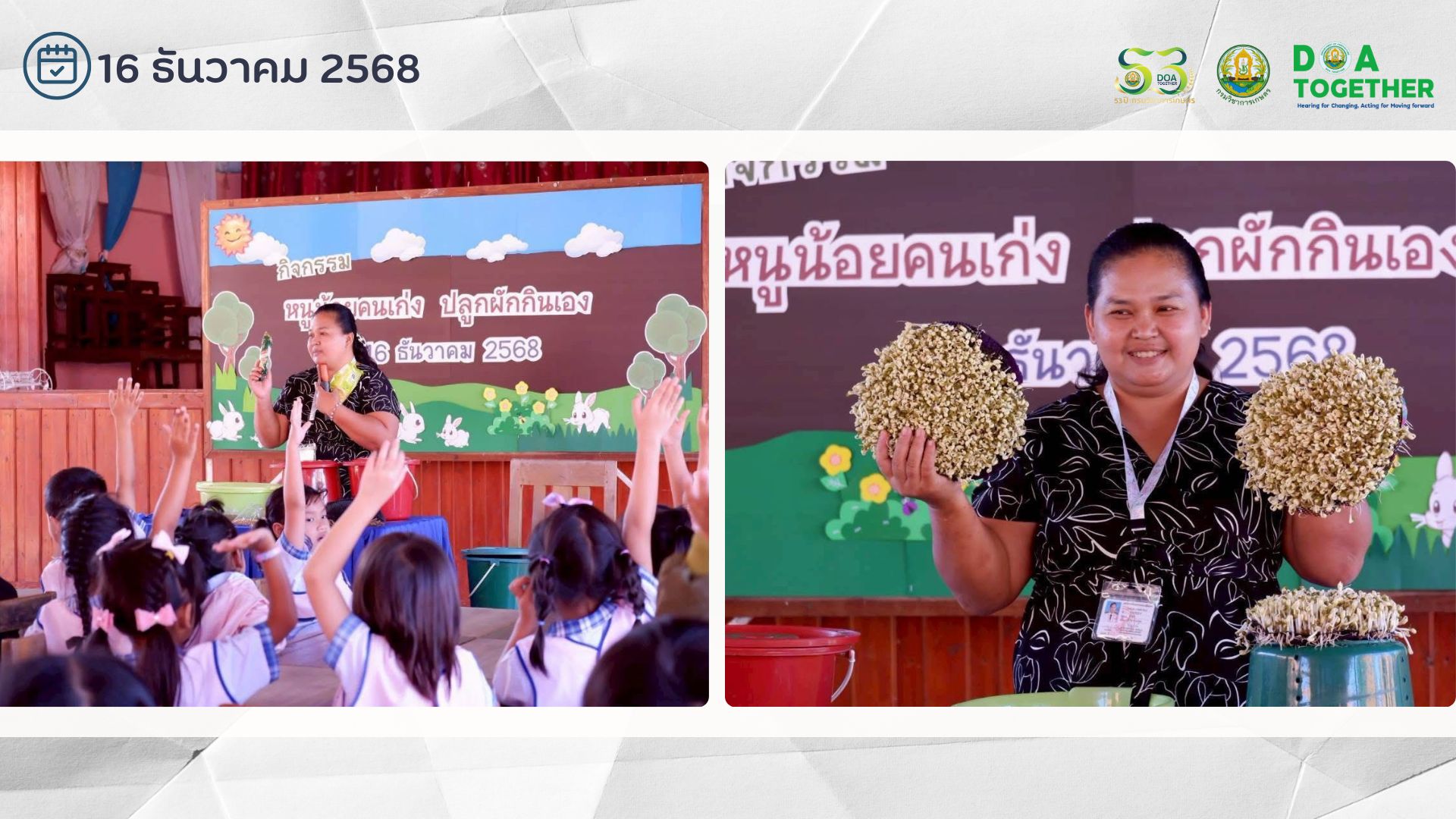 วันที่ 16 ธันวาคม 2568 นายชูชาติ บุญศักดิ์ ผู้อำนวยการศูนย์วิจัยและพัฒนาเมล็ดพันธุ์พืชลพบุรีมอบหมายให้นางนภัสร์นันต์ เชื้อแก้ว นักวิชาการเกษตร เป็นวิทยากรและบรรยายให้ความรู้การปลูกถั่วงอกคอนโด ในโครงการหนูน้อยคนเก่งปลูกผักกินเอง เพื่อให้เด็กๆได้ปฏิบัติจริงส่งเสริมการพัฒนาทั้ง 4 ด้าน ปลูกฝังหลักปรัชญาเศรษฐกิจพอเพียง ให้เด็กรู้คุณค่าอาหาร และส่งเสริมสุขภาพผ่านการทานผักปลอดสารพิษ โดยลงมือปลูกดูแลและเก็บเกี่ยว แล้วนำผักไปประกอบอาหาร ให้กับนักเรียนระดับชั้นอนุบาลปีที่ 3 จำนวน 83 คน ณ ห้องประชุมโรงเรียนงามมีศรีพัฒนา ตำบลดีลัง อำเภอพัฒนานิคม จังหวัดลพบุรี
