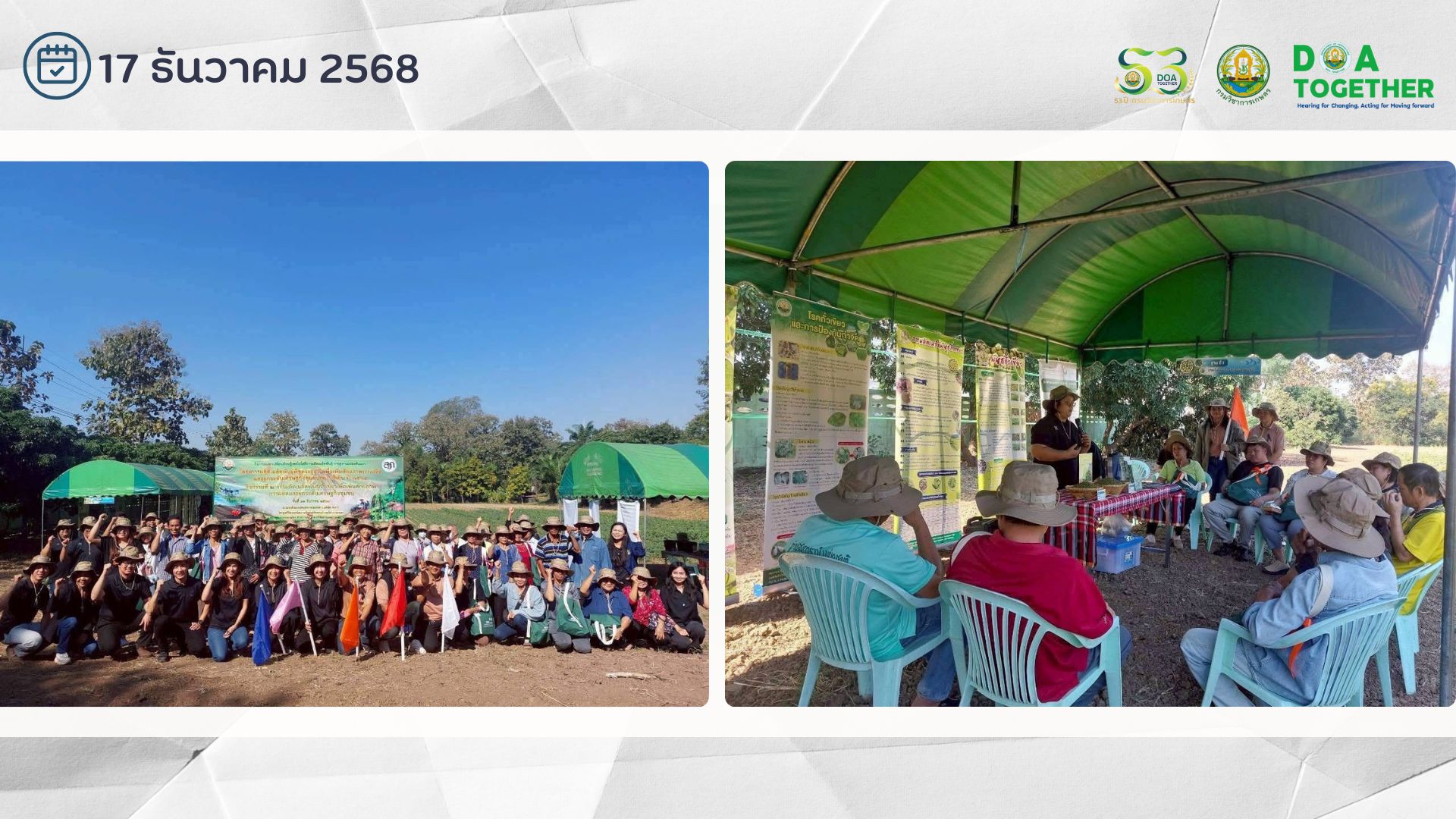 วันที่ 17 ธันวาคม 2568 นายชูชาติ บุญศักดิ์ ผู้อำนวยการศูนย์วิจัยและพัฒนาเมล็ดพันธุ์พืชลพบุรี และเจ้าหน้าที่ศูนย์วิจัยและพัฒนาเมล็ดพันธุ์พืชลพบุรี พร้อมด้วย หน่วยงานเครือข่ายภายในกรมวิชาการเกษตรร่วมกันจัดกิจกรรมแลกเปลี่ยนเรียนรู้เทคโนโลยีการผลิตเมล็ดพันธุ์ การดูงานแปลงต้นแบบ ภายใต้โครงการ : ผลิตเมล็ดพันธุ์พืชตระกูลถั่วเพื่อเพิ่มศักยภาพการผลิตและยกระดับเศรษฐกิจชุมชนอย่างยั่งยืน ปี 2568 กิจกรรมที่ 2 : การผลิตเมล็ดพันธุ์ถั่วเขียวเพื่อเพิ่มศักยภาพการผลิตและยกระดับเศรษฐกิจชุมชน โดยประกอบไปด้วยฐานเรียนรู้จำนวน 5 ฐาน ได้แก่ ฐานที่ 1 เทคโนโลยีการใช้เมล็ดพันธุ์ดีฐานที่ 2 เทคโนโลยีการใช้ปุ๋ยชีวภาพไรโซเบียฐานที่ 3 การใช้สารบราสสิโนสเตียรอยด์ในการเพิ่มผลผลิตเมล็ดพันธุ์พืชตระกูลถั่วภายใต้สภาวะแห้งแล้งฐานที่ 4 เทคโนโลยีเครื่องจักรกลการปลูกและดูแลรักษาถั่วเขียวฐานที่ 5 การทดสอบความงอกเมล็ดพันธุ์ถั่วเขียวอย่างง่ายและการแปรรูปถั่วเขียว โดยมีเกษตรกรเข้าร่วมจำนวน 50 ราย ณ แปลงต้นแบบ นิคมสหกรณ์แม่สอด ตำบลแม่กาษา อำเภอแม่สอด จังหวัดตาก