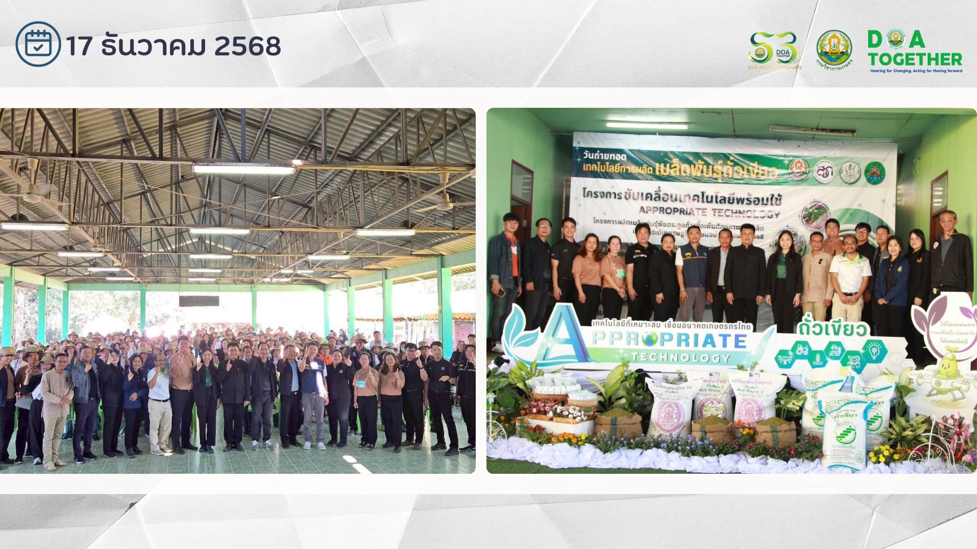 วันที่ 17 ธันวาคม 2568 นายชูชาติ บุญศักดิ์ ผู้อำนวยการศูนย์วิจัยและพัฒนาเมล็ดพันธุ์พืชลพบุรี และเจ้าหน้าที่ศูนย์วิจัยและพัฒนาเมล็ดพันธุ์พืชลพบุรี พร้อมด้วย หน่วยงานเครือข่ายภายในกรมวิชาการเกษตร หน่วยงานภายนอกและภาคเอกชน ร่วมกันจัดกิจกรรมวันถ่ายทอดเทคโนโลยีการผลิตเมล็ดพันธุ์ถั่วเขียว ภายใต้โครงการ : ผลิตเมล็ดพันธุ์พืชตระกูลถั่วเพื่อเพิ่มศักยภาพการผลิตและยกระดับเศรษฐกิจชุมชนอย่างยั่งยืน ปี 2568 กิจกรรมที่ 2 : การผลิตเมล็ดพันธุ์ถั่วเขียวเพื่อเพิ่มศักยภาพการผลิตและยกระดับเศรษฐกิจชุมชน โดยมี นางสาวเชาวนาถ พฤทธิเทพ ผู้เชี่ยวชาญด้านพืชไร่ตระกูลถั่ว หัวหน้าโครงการวิจัยดังกล่าว ได้รายงานวัตถุประสงค์ของโครงการแก่ประธานในพิธี นายวิษณุ คำพินิจ เกษตรจังหวัดตาก ซึ่งมีเกษตรกรและผู้เข้าร่วมจำนวน 100 ราย โดยกิจกรรมดังกล่าวจัดขึ้น ณ อาคารอเนกประสงค์ นิคมสหกรณ์แม่สอด ตำบลแม่กาษา อำเภอแม่สอด จังหวัดตาก