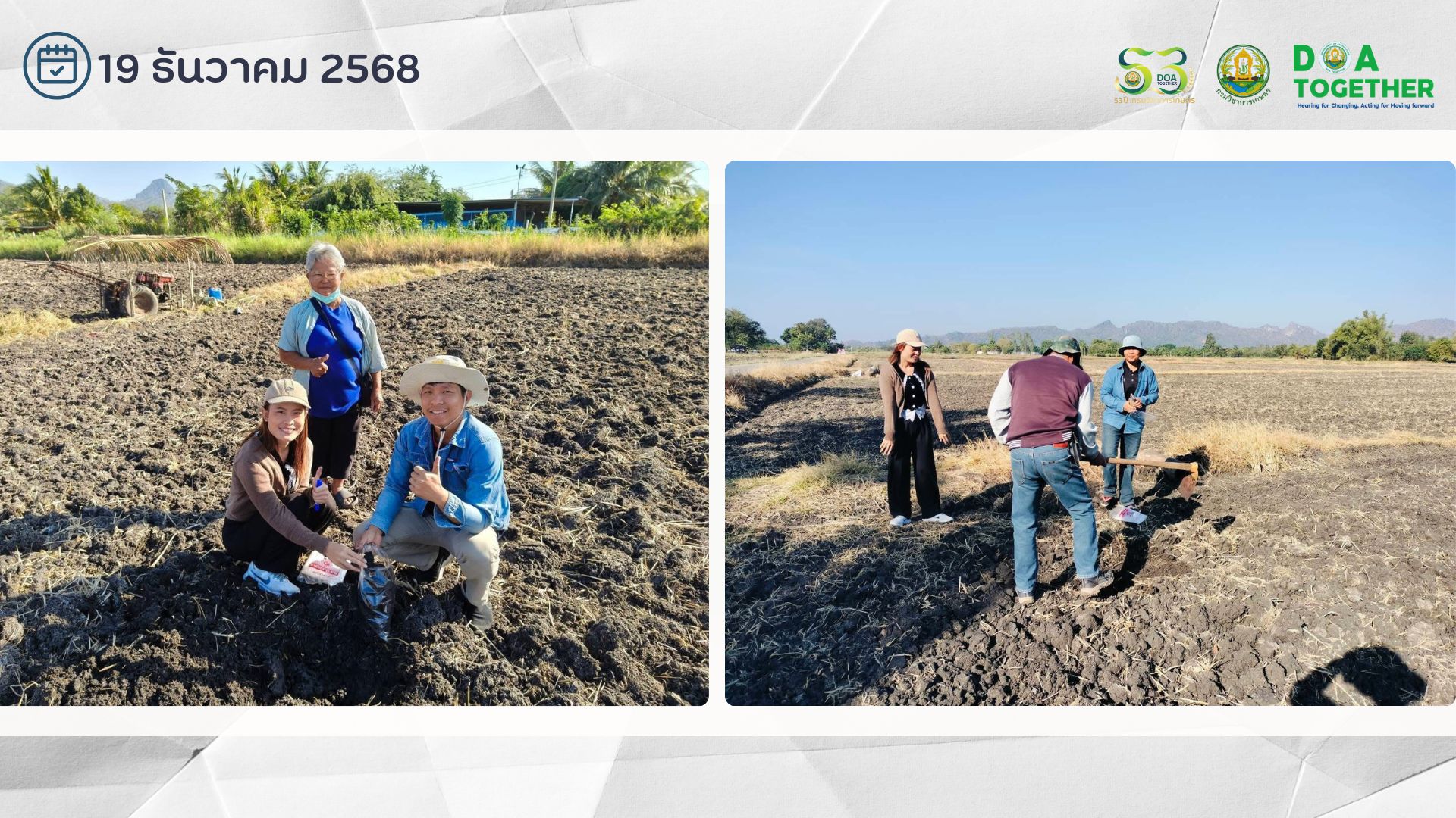 วันที่ 19 ธันวาคม 2568 นายชูชาติ บุญศักดิ์ ผู้อำนวยการศูนย์วิจัยและพัฒนาเมล็ดพันธุ์พืชลพบุรี มอบหมายให้ นายอินทร์ อินโต เจ้าพนักงานการเกษตรปฏิบัติงาน และนางสาวสุพัตรา ชุมผาง นักวิชาการเกษตร ลงพื้นที่ร่วมกับ นางสาวธัญญฉัตร์ เธียรโชติชัยกิจ นักวิชาการส่งเสริมการเกษตรชำนาญการ สำนักงานเกษตรจังหวัดลพบุรี ดำเนินการสุ่มเก็บตัวอย่างดินแปลงเกษตรกรผู้เข้าร่วมโครงการการยกระดับประสิทธิภาพการผลิตถั่วลิสงฝักสดในพื้นที่ภาคกลางเพื่อเพิ่มมูลค่าและสร้างโอกาสเชิงพาณิชย์ เพื่อนำตัวอย่างดินมาทดสอบ ด้วยชุดตรวจสอบดินอย่างง่าย (DOA-Soil Test Kits) ณ ไร่เกษตรกร ตำบลนิคมสร้างตนเอง อำเภอเมืองลพบุรี จังหวัดลพบุรี
