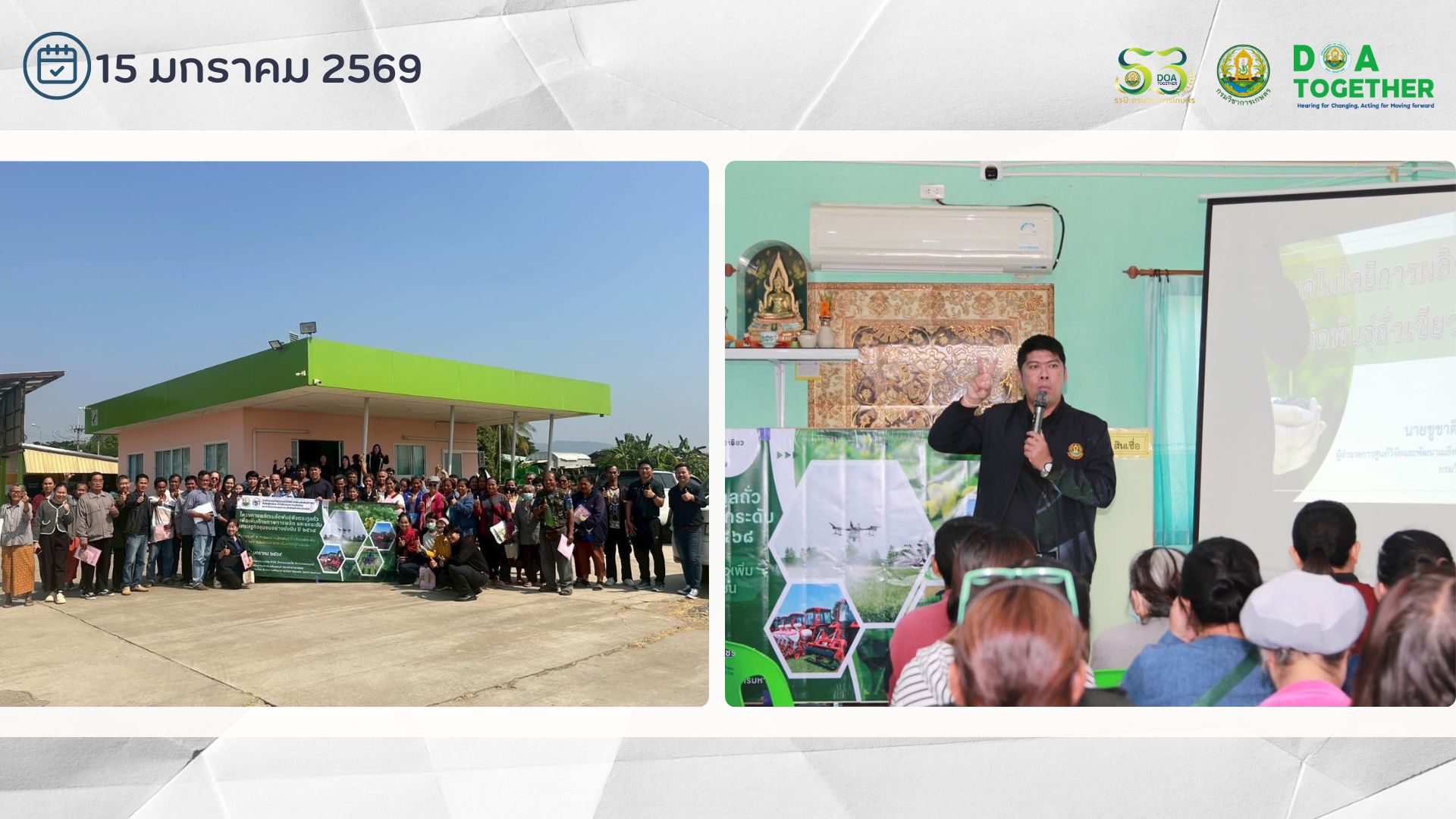 วันที่ 15 มกราคม 2569 นายชูชาติ บุญศักดิ์ ผู้อำนวยการศูนย์วิจัยและพัฒนาเมล็ดพันธุ์พืชลพบุรี และคณะ ดำเนินการจัดฝึกอบรมถ่ายทอดเทคโนโลยีการผลิตเมล็ดพันธุ์ถั่วเขียวชั้นพันธุ์จำหน่าย การปรับปรุงสภาพเมล็ดพันธุ์ และการตรวจสอบคุณภาพเมล็ดพันธุ์ถั่วเขียวอย่างง่าย ภายใต้โครงการขับเคลื่อนเทคโนโลยีพร้อมใช้ (Appropriate Technology) ประจำปี 2568 ในโครงการผลิตเมล็ดพันธุ์พืชตระกูลถั่วเพื่อเพิ่มศักยภาพการผลิตและยกระดับเศรษฐกิจชุมชนอย่างยั่งยืน ปี 2568 โดยมี เกษตรกรผู้เข้าร่วมจำนวน 51 ราย ณ สหกรณ์การเกษตรหนองไผ่จำกัด อำเภอหนองไผ่ จังหวัดเพรชบูรณ์