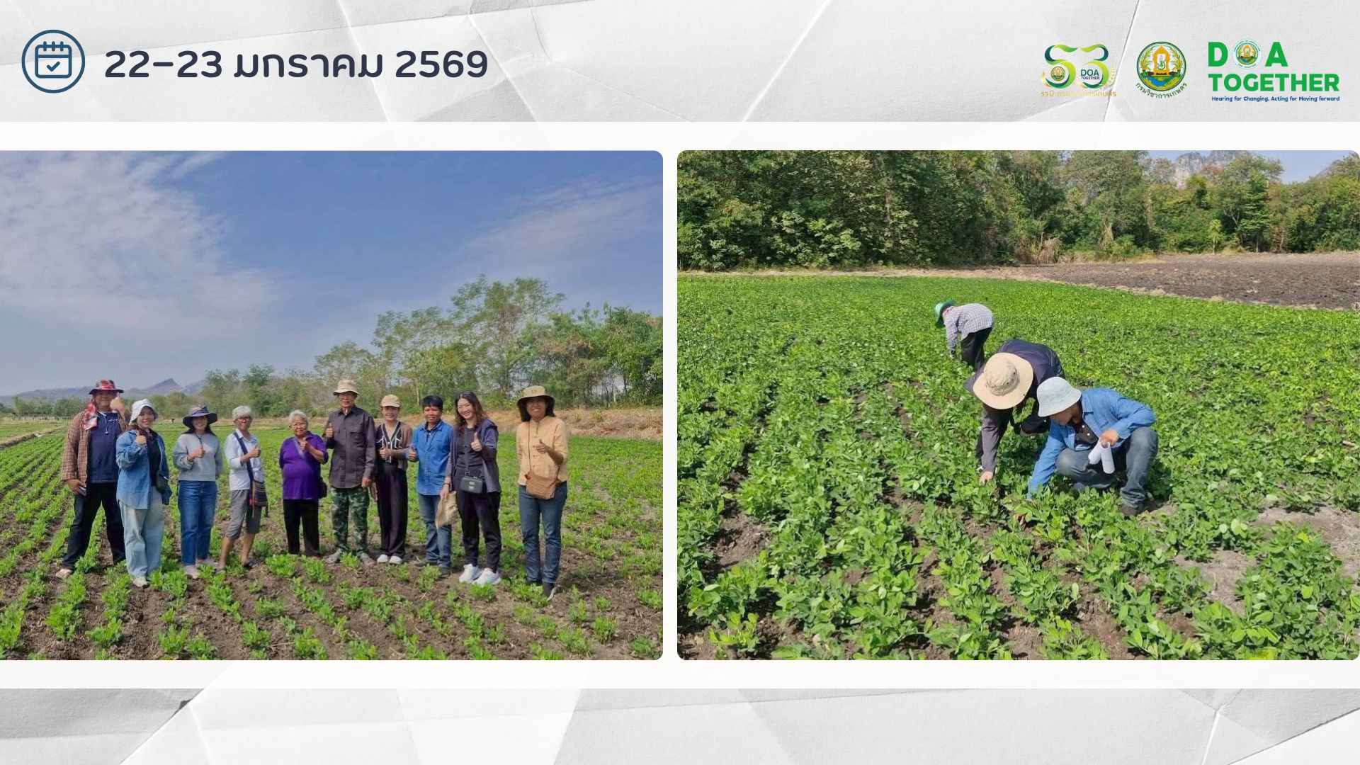 วันที่ 22-23 มกราคม 2569 นายชูชาติ บุญศักดิ์ ผู้อำนวยการศูนย์วิจัยและพัฒนาเมล็ดพันธุ์พืชลพบุรี มอบหมายให้ นายอินทร์ อินโต เจ้าพนักงานการเกษตรปฏิบัติงาน และนางสาวสุพัตรา ชุมผาง นักวิชาการเกษตร ลงพื้นที่ร่วมกับเจ้าหน้าที่โครงการการยกระดับประสิทธิภาพการผลิตถั่วลิสงฝักสดในพื้นที่ภาคกลางเพื่อเพิ่มมูลค่าและสร้างโอกาสเชิงพาณิชย์ ดำเนินการส่งมอบปัจจัยการผลิตและสำรวจคัดพันธุ์ ตรวจโรค แมลง ในแปลงเกษตรกรผู้ผลิตถั่วลิสงพันธุ์ กวก. กาฬสินธุ์ 2 ภายใต้โครงการการยกระดับประสิทธิภาพการผลิตถั่วลิสงฝักสดในพื้นที่ภาคกลางเพื่อเพิ่มมูลค่าและสร้างโอกาสเชิงพาณิชย์ ณ บ้านท่าเดื่อใหญ่ หมู่ที่ 4 และ บ้านท่าเดื่อน้อย หมู่ที่ 5 ตำบลนิคมสร้างตนเอง อำเภอเมืองลพบุรี จังหวัดลพบุรี โดยมีนางกุลศิริ เวียงวิเศษ หัวหน้าโครงการร่วมลงพื้นที่