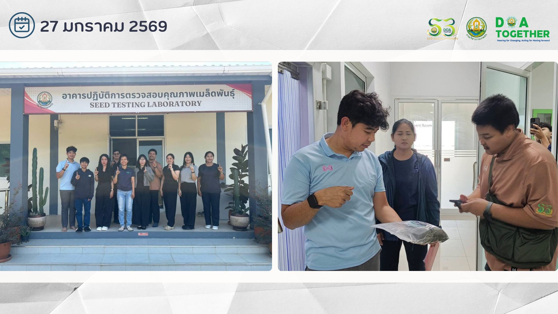วันที่ 27 มกราคม 2569 นายชูชาติ บุญศักดิ์ ผู้อำนวยการศูนย์วิจัยและพัฒนาเมล็ดพันธุ์พืชลพบุรี มอบหมายให้ นางสาวเฌอรัชด์พัชร เขียววิชัย นักวิชาการเกษตรปฏิบัติการ และเจ้าหน้าที่ ร่วมรายงานผลการดำเนินกิจกรรมการตรวจสอบรับรองคุณภาพสุขอนามัยเมล็ดพันธุ์พืชตามมาตรฐานสากล ในโครงการพัฒนาศักยภาพกระบวนการผลิตสินค้าเกษตร กิจกรรม : การพัฒนาศักยภาพกระบวนการผลิตสินค้าเกษตร ประจำปีงบประมาณ 2569 โดยมีนายชัชชัย ชาติทรัพย์สิน นักวิชาการเกษตร และเจ้าหน้าที่จากกลุ่มบริหารโครงการและวางแผนการผลิต กองวิจัยพัฒนาเมล็ดพันธุ์พืช เข้าร่วมติดตามผลการดำเนินงาน ณ อาคารห้องปฏิบัติการตรวจสอบคุณภาพเมล็ดพันธุ์ ศูนย์วิจัยและพัฒนาเมล็ดพันธุ์พืชลพบุรี ตำบลโคกตูม อำเภอเมือง จังหวัดลพบุรี