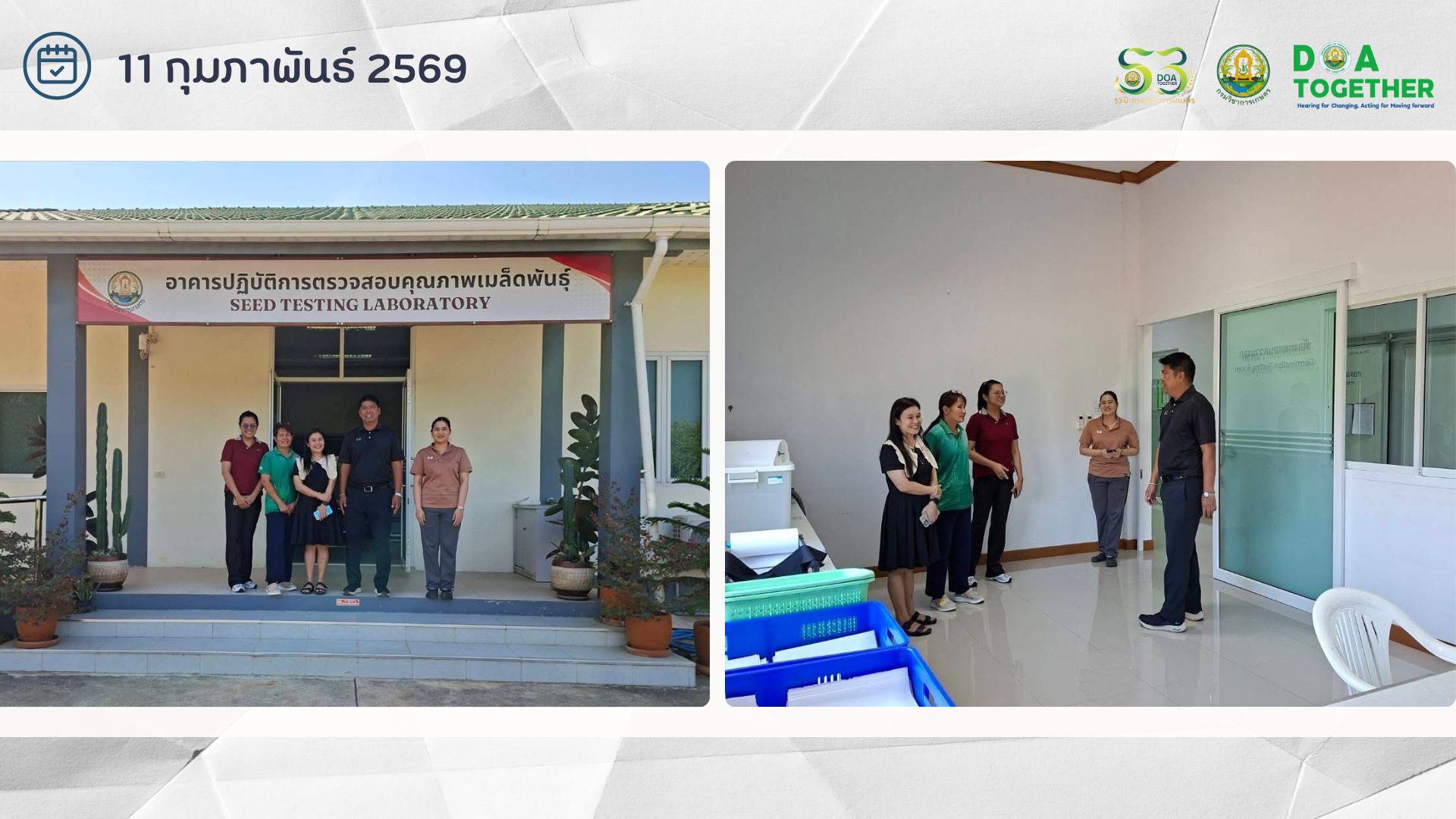 วันที่ 11 กุมภาพันธ์ 2569 นายชูชาติ บุญศักดิ์ ผู้อำนวยการศูนย์วิจัยและพัฒนาเมล็ดพันธุ์พืชลพบุรี ได้ต้อนรับคุณมัลลิกา ประพัสรางค์ ผู้จัดการห้องปฏิบัติการเมล็ดพันธุ์ และคณะติดตาม ของบริษัทแปซิฟิคเมล็ดพันธุ์จำกัด เข้าเยี่ยมชมอาคารตรวจสอบคุณภาพเมล็ดพันธุ์ ของศูนย์วิจัยและพัฒนาเมล็ดพันธุ์พืชลพบุรี โดยได้มีการแลกเปลี่ยนเรียนรู้ ร่วมหารือเกี่ยวกับเทคโนโลยีการตรวจสอบคุณภาพเมล็ดพันธุ์ อุปกรณ์และเครื่องมือต่าง ๆ โดยศวม.ลพบุรีได้มีการเตรียมพร้อมสู่การเป็นห้องปฏิบัติการตรวจสอบคุณภาพเมล็ดพันธุ์ตามมาตรฐานของกรมวิชาการเกษตร
