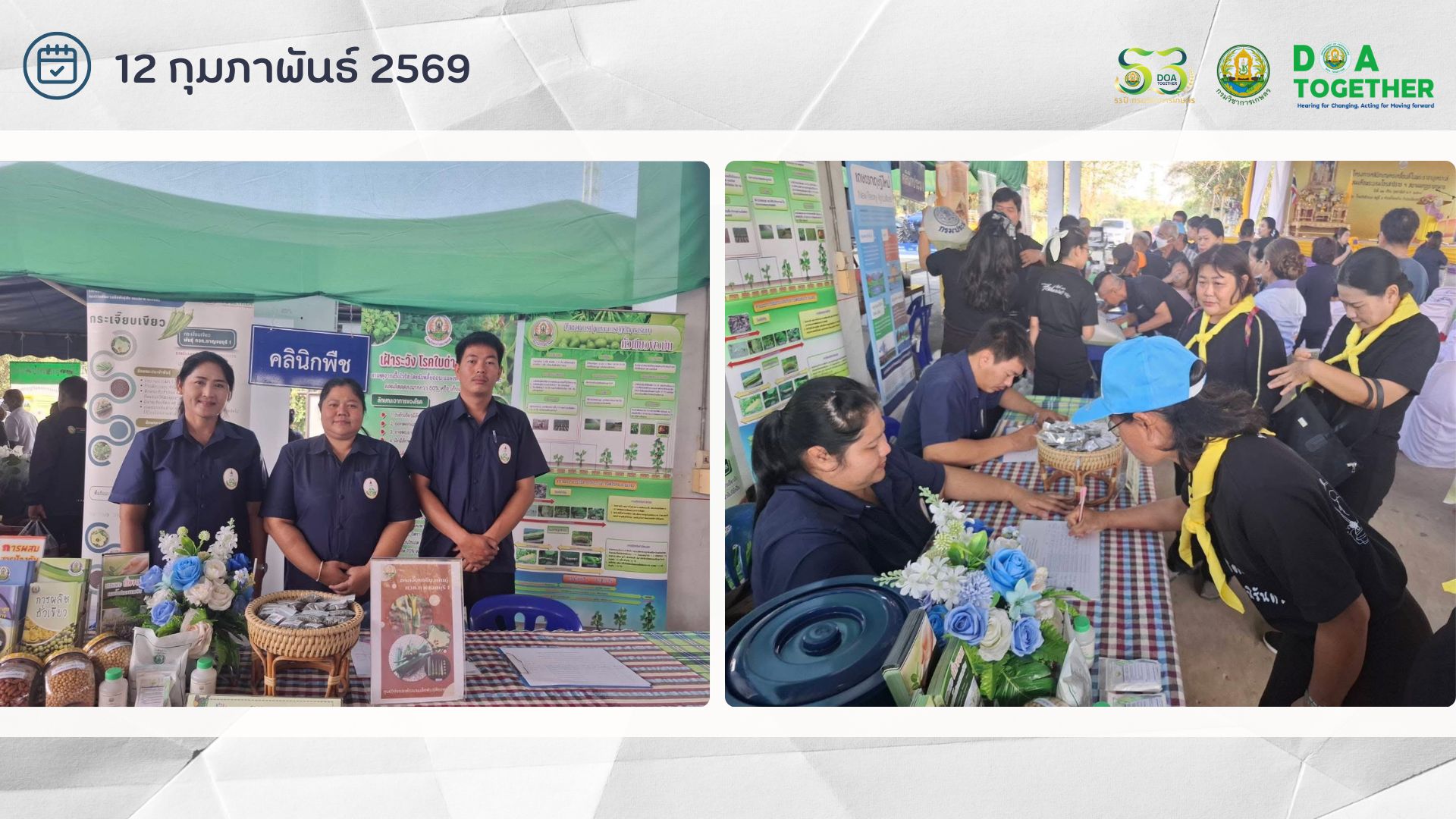 วันที่ 12 กุมภาพันธ์ 2569 นายชูชาติ บุญศักดิ์ ผู้อำนวยการศูนย์วิจัยและพัฒนาเมล็ดพันธุ์พืชลพบุรี มอบหมายให้ นางสาวสมศรี ยอดทอง นักวิชาการเกษตร และเจ้าหน้าที่ศูนย์ฯ ร่วมจัดนิทรรศการให้บริการความรู้ด้านพืช (คลินิกพืช) โครงการคลินิกเกษตรเคลื่อนที่ในพระราชานุเคราะห์ สมเด็จพระบรมโอรสาธิราช ฯ สยามมกุฎราชกุมาร จ.สระบุรี ครั้งที่ 2 ประจำปี 2569 ให้ความรู้เกี่ยวกับการผลิตถั่วเขียว เทคโนโลยีการผลิตถั่วเขียวหลังนา โรคแมลงศัตรูพืช การเพาะถั่วงอกคอนโดปลอดสารพิษ และแจกปัจจัยการผลิตทางการเกษตร เมล็ดพันธ์ุกระเจี๊ยบเขียวพันธุ์ กวก.กาญจนบุรี 1 แก่เกษตรกรผู้ร่วมลงทะเบียน โดยมี นายบัญชา เชาวรินทร์ผู้ว่าราชการจังหวัดสระบุรี เป็นประธานในพิธี ณ โดมวัดหัวถนน หมู่ที่ 5 ตำบลโคกสว่าง อำเภอเมืองสระบุรี จังหวัดสระบุรี มีเกษตรกรเข้ารับบริการคลินิกพืช คลินิก (02) จำนวน 102 ราย (05) 2 ราย