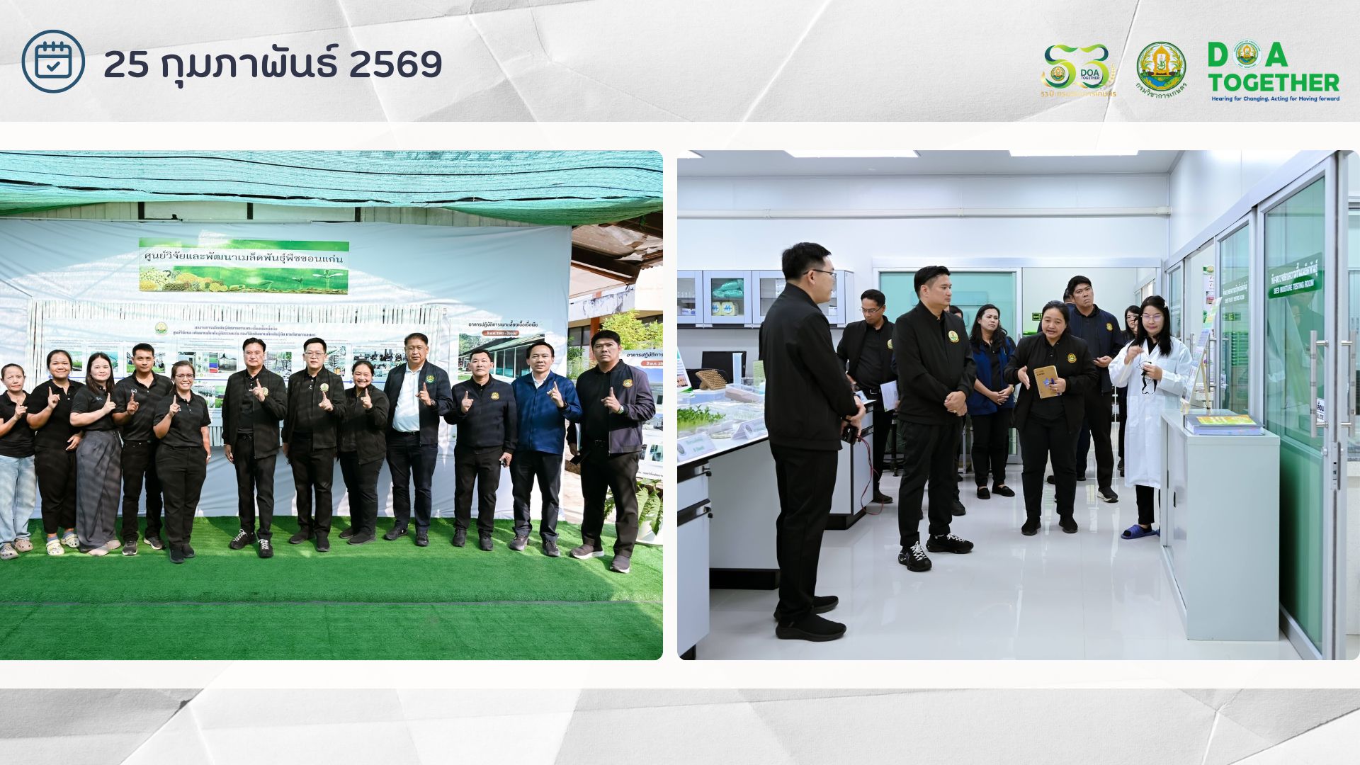 วันที่ 25 กุมภาพันธ์ 2569 นายชูชาติ บุญศักดิ์ ผู้อำนวยการศูนย์วิจัยและพัฒนาเมล็ดพันธุ์พืชลพบุรี และเจ้าหน้าที่ศูนย์ฯ ได้ร่วมต้อนรับนายรพีภัทร์ จันทรศรีวงศ์ อธิบดีกรมวิชาการเกษตร ลงพื้นที่ตรวจเยี่ยมและติดตามการดำเนินงานของศูนย์วิจัยและพัฒนาเมล็ดพันธุ์พืชขอนแก่น จังหวัดขอนแก่น เพื่อขับเคลื่อนนโยบายการพัฒนาประเทศสู่การเป็นศูนย์กลางเมล็ดพันธุ์พืชในภูมิภาคเอเชียและแปซิฟิก (APEC) และก้าวสู่การเป็นผู้นำด้านเมล็ดพันธุ์พืชผักเขตร้อนคุณภาพสูงของโลก (World Leader of Tropical Seeds) และได้เยี่ยมชมพื้นที่ห้องตรวจสอบคุณภาพเมล็ดพันธุ์ ห้องตรวจสอบโรค ห้องเพาะเลี้ยงเนื้อเยื่อ และอาคารปรับปรุงสภาพเมล็ดพันธุ์ ของศูนย์วิจัยและพัฒนาเมล็ดพันธุ์พืชขอนแก่น จังหวัดขอนแก่น