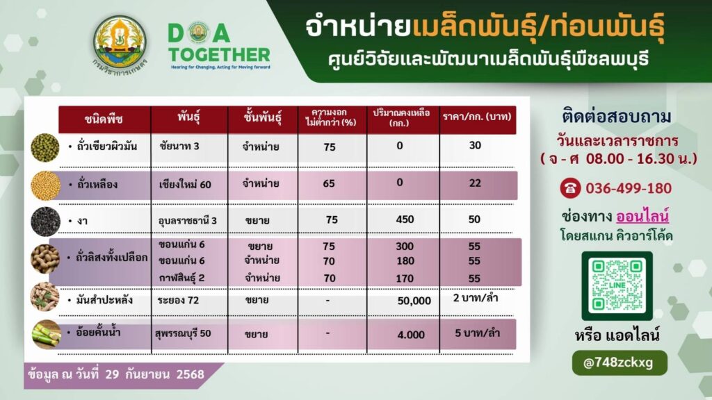 อัพเดทข้อมูลได้ที่ facebook page ศูนย์วิจัยและพัฒนาเมล็ดพันธุ์พืชลพบุรี (คลิกลิงค์)