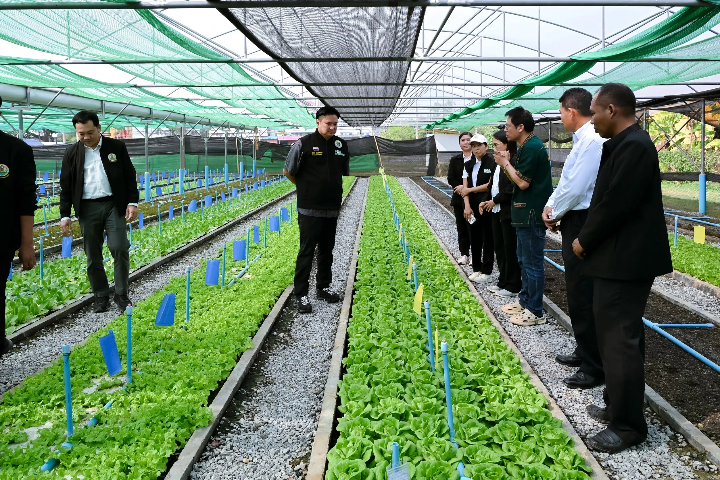 ในการนี้ นางสาวพรทิพย์ แพงจันทร์ ผู้อำนวยการศูนย์วิจัยและพัฒนาการเกษตรกาฬสินธุ์ กล่าวรายงานและนำคณะผู้บริหารลงพื้นที่ตรวจเยี่ยมฟาร์มเกื้อบุญผักปลอดสาร ซึ่งเป็นแปลงขยายผล จากโครงการ 76 โมเดล โดยนำเทคโนโลยีของกรมวิชาการเกษตร มาปรับใช้ในการผลิตพืชผักอินทรีย์ในสภาพโรงเรือน อาทิเช่น การใช้แหนแดงแห้งผสมกับดินปลูก การใช้ชีวภัณฑ์ต่างๆ ควบคุมศัตรูพืช ซึ่งทำให้ได้ผลิตผลที่มีคุณภาพ ได้ราคาสูง สามารถลดต้นทุนการผลิตได้มากกว่าร้อยละ 60 ขณะนี้ได้รับการรับรองมาตรฐานเกษตรอินทรีย์ในระยะปรับเปลี่ยน และใช้เป็นแหล่งเรียนรู้ให้เกษตรกรเครือข่ายด้านเกษตรอินทรีย์ในจังหวัดกาฬสินธุ์และจังหวัดใกล้เคียง