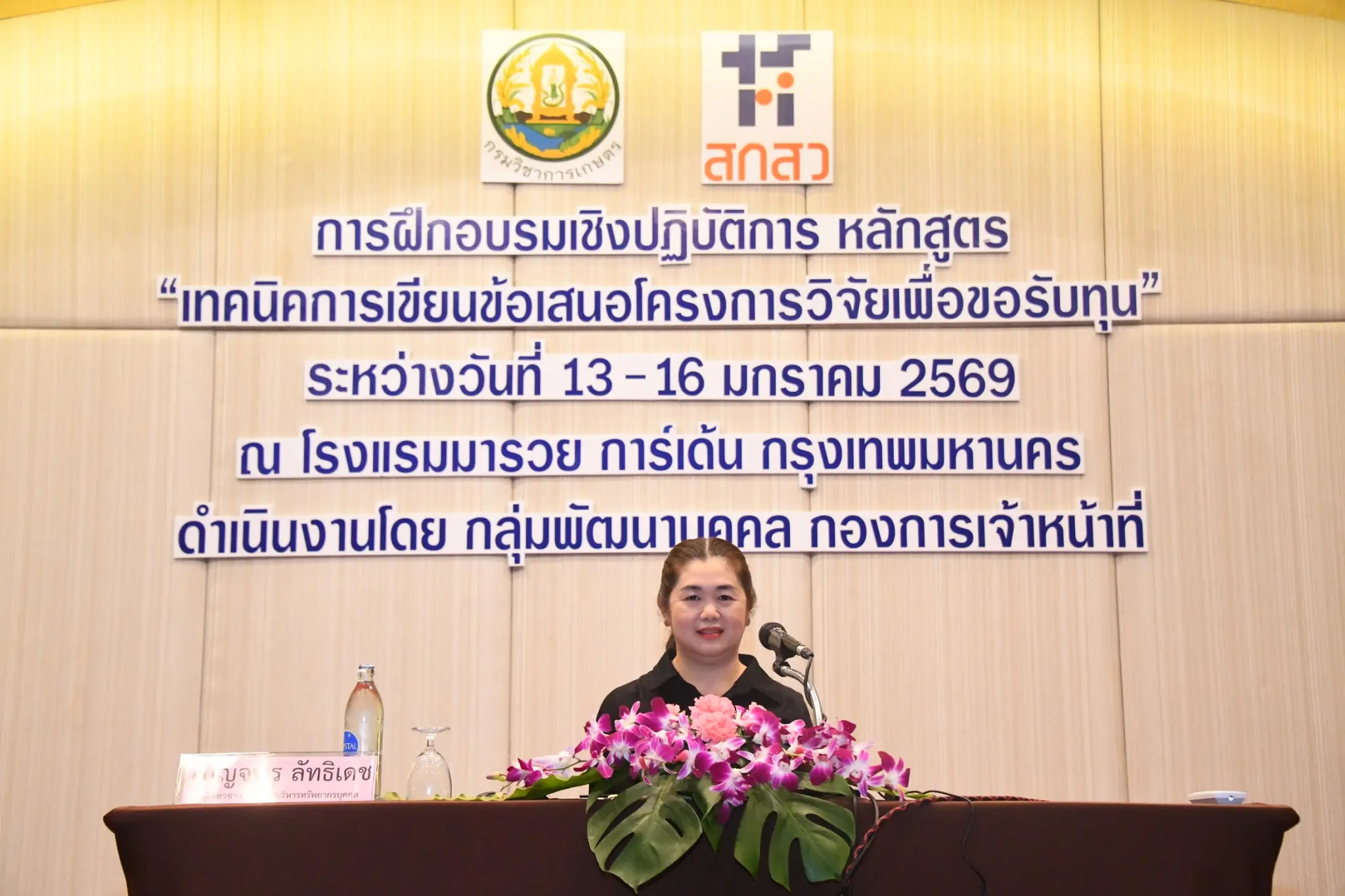 เมื่อวันที่ 13 มกราคม 2569 นายรพีภัทร์ จันทรศรีวงศ์ อธิบดีกรมวิชาการเกษตร มอบหมายให้นางสาวเบญจพร ลัทธิเดช ผู้เชี่ยวชาญด้านการบริหารทรัพยากรบุคคล กองการเจ้าหน้าที่ เป็นประธานในพิธีเปิดการฝึกอบรมเชิงปฏิบัติการ หลักสูตร “เทคนิคการเขียนข้อเสนอโครงการวิจัยเพื่อขอรับทุน” โดยมี นางสาวภิญญาภัช ฤทธิแพทย์ ผู้อำนวยการกลุ่มพัฒนาบุคคล เป็นผู้กล่าวรายงานต่อประธานในพิธีเปิดการฝึกอบรม ณ ห้อง Ballroom A ชั้น 2 โรงแรมมารวย การ์เด้น กรุงเทพมหานคร