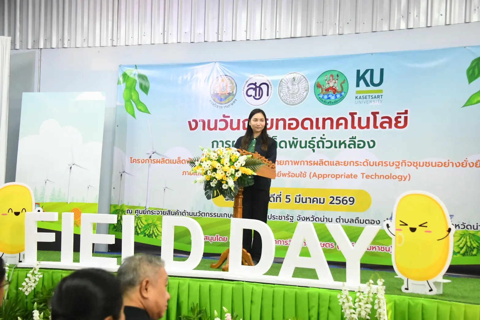 เมื่อวันที่ 5 มีนาคม 2569 อธิบดีกรมวิชาการเกษตร มอบหมายให้ นางสาวเชาวนาถ พฤทธิเทพ ผู้เชี่ยวชาญพืชไร่ตระกูลถั่ว และ ผู้อำนวยการกองวิจัยพัฒนาพืชเศรษฐกิจใหม่และการจัดการก๊าซเรือนกระจกสำหรับภาคเกษตร เป็นประธานในงานวันถ่ายทอดเทคโนโลยีการผลิตเมล็ดพันธุ์ถั่วเหลือง โครงการผลิตเมล็ดพันธุ์พืชตระกูลถั่วเพื่อเพิ่มศักยภาพการผลิตและยกระดับเศรษฐกิจชุมชนอย่างยั่งยืน ภายใต้โครงการขับเคลื่อนเทคโนโลยีพร้อมใช้ (Appropriate Technology) ณ ศูนย์กระจายสินค้าด้านนวัตกรรมเกษตรปลอดภัย ประชารัฐ จังหวัดน่าน ต.ถืมตอง อ.เมืองน่าน จ.น่าน โดยศูนย์วิจัยและพัฒนาเมล็ดพันธุ์พืชพิษณุโลก กองวิจัยพัฒนาเมล็ดพันธุ์พืช กรมวิชาการเกษตร เป็นหน่วยงานหลักในการจัดงาน และได้รับการสนับสนุนจากภาคีเครือข่ายถั่วเหลือง ได้แก่ หน่วยงานภายใต้กรมวิชาการเกษตร กรมส่งเสริมการเกษตร และกรมส่งเสริมสหกรณ์ รวมทั้งมหาวิทยาลัยเกษตรศาสตร์ สหกรณ์การเกษตรเพื่อการตลาดลูกค้า ธกส.น่าน จำกัด และ บริษัทปิยะดล จำกัด ร่วมจัดนิทรรศการ ฐานเรียนรู้ด้านเทคโนโลยีการผลิตเมล็ดพันธุ์ถั่วเหลือง และ การเสวนาในหัวข้อเรื่อง “เทคโนโลยีการผลิตเมล็ดพันธุ์ถั่วเหลืองที่เหมาะสม สู่ความมั่นคงและยั่งยืน เพิ่มรายได้แก่เกษตรกร” โดยมีผู้เข้าร่วมงานจากภาครัฐ เอกชน และกลุ่มเกษตรกร ทั้งสิ้น 200 ราย โครงการนี้ได้รับการสนับสนุนงบประมาณจาก สำนักงานพัฒนาการวิจัยการเกษตร (องค์การมหาชน) โดยมีวัตถุประสงค์เพื่อถ่ายทอดและขยายผลเทคโนโลยีที่เหมาะสมในการผลิตเมล็ดพันธุ์ถั่วเหลืองชั้นพันธุ์จำหน่ายให้แก่เกษตรกรในเขตพื้นที่ภาคเหนือ ซึ่งสอดคล้องกับนโยบายของกระทรวงเกษตรและสหกรณ์ และกรมวิชาการเกษตร ที่เร่งขับเคลื่อนการใช้เทคโนโลยีจากผลงานวิจัย และเทคโนโลยีการเกษตรที่เหมาะสม สู่เกษตรกร เพื่อให้เกษตรกรนำเทคโนโลยีไปปรับใช้ในการเพิ่มประสิทธิภาพการผลิตทั้งด้านปริมาณและคุณภาพ สามารถส่งต่อเมล็ดพันธุ์คุณภาพดีภายในชุมชนของตนเองและพื้นที่ใกล้เคียงได้มากขึ้น ยกระดับคุณภาพชีวิตของเกษตรกร ส่งผลให้เกิดความมั่นคงและยั่งยืนทางด้านอาหารต่อไป