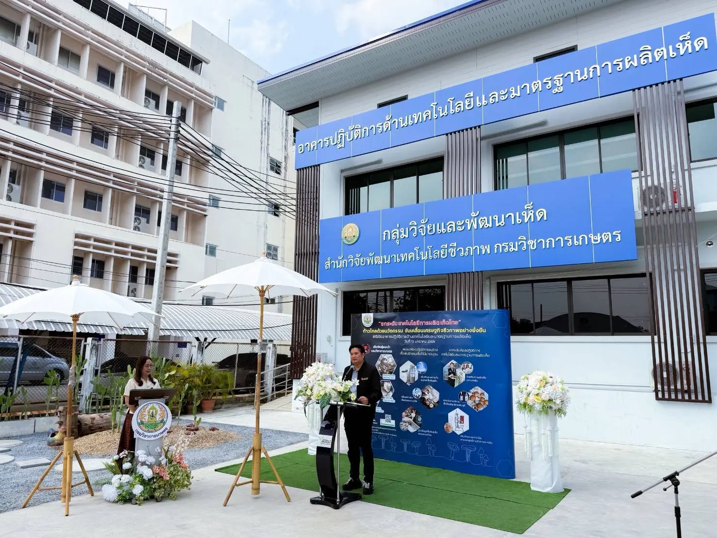 ด้าน ดร.ปิยรัตน์ ธรรมกิจวัฒน์ ผู้อำนวยการสำนักวิจัยพัฒนาเทคโนโลยีชีวภาพ กล่าวว่า อาคารปฏิบัติการด้านเทคโนโลยีและมาตรฐานการผลิตเห็ด ได้รับงบประมาณก่อสร้างในปีงบประมาณ พ.ศ. 2567 และแล้วเสร็จในเดือนมีนาคม พ.ศ. 2568 มีวัตถุประสงค์เพื่อรองรับการปฏิบัติงานด้านการวิจัยและพัฒนาเทคโนโลยีและมาตรฐานการผลิตเห็ด รวมถึงเป็นศูนย์เรียนรู้และถ่ายทอดเทคโนโลยีด้านเห็ดและจุลินทรีย์ของกรมวิชาการเกษตร
