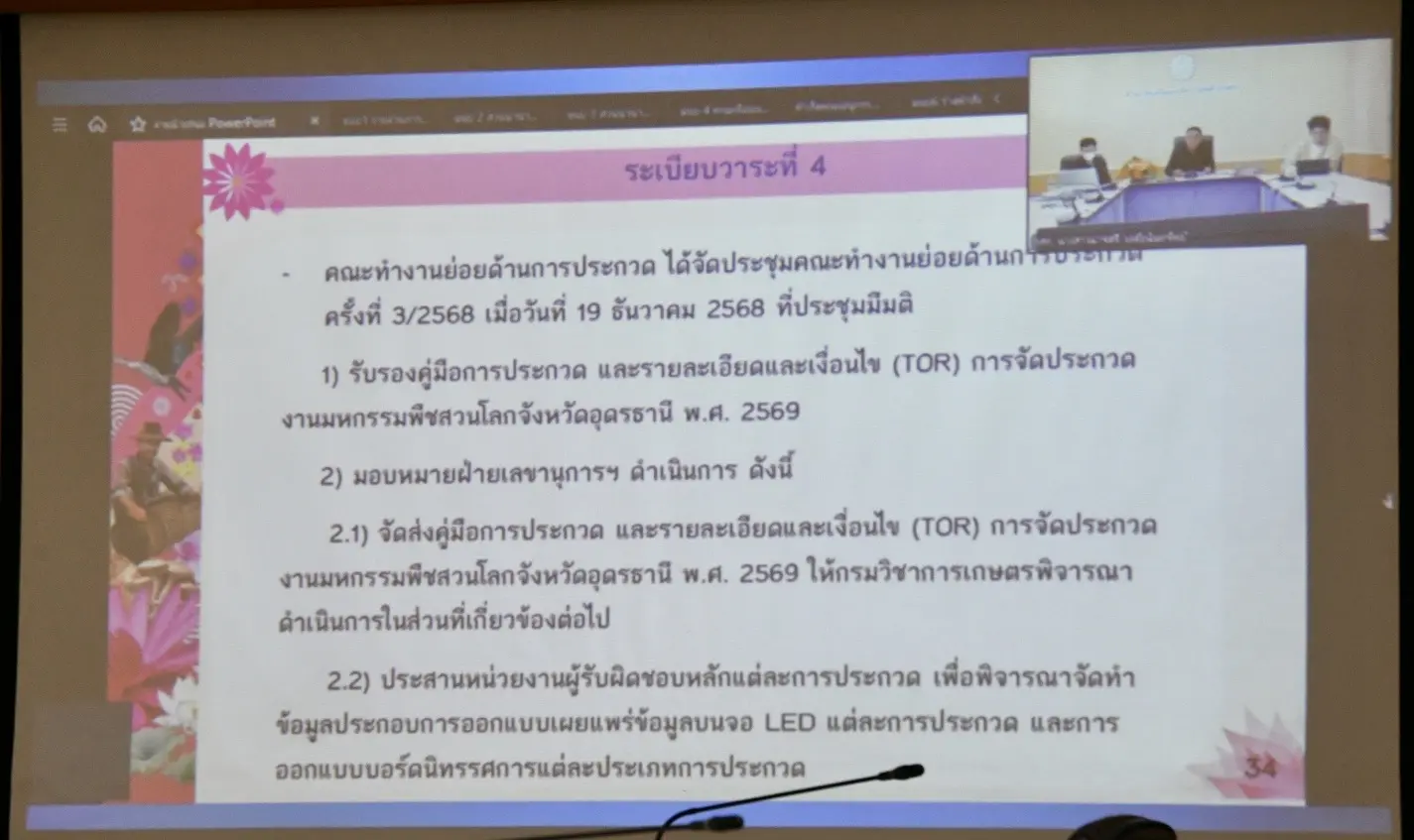 เมื่อวันที่26 กุมภาพันธ์ 2569 นายรพีภัทร์ จันทรศรีวงศ์ อธิบดีกรมวิชาการเกษตร มอบหมายให้นางศศิญา ปานตั้น รองอธิบดีกรมวิชาการเกษตร เป็นประธานในการประชุมคณะทำงานด้านการต่างประเทศ การประชุมสัมมนาวิชาการ และการประกวด ครั้งที่ 1/2569 เพื่อพิจารณาทบทวนคำสั่งคณะทำงานต่างประเทศ การประชุมสัมมนาวิชาการ และการประกวด ณ ห้องประชุมใหญ่ ชั้น 2 อาคารศูนย์ปฏิบัติการฝึกอบรมและถ่ายทอดเทคโนโลยี กรมวิชาการเกษตร และผ่านสื่ออิเล็กทรอนิกส์ จากแอปพลิเคชัน Zoom Cloud Meetings