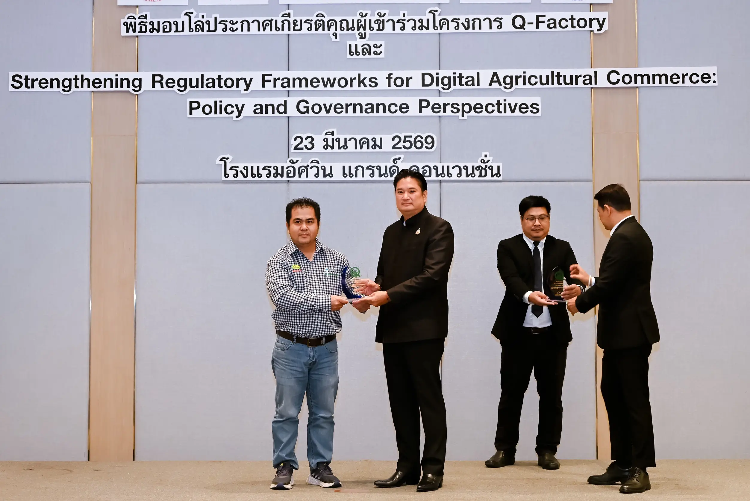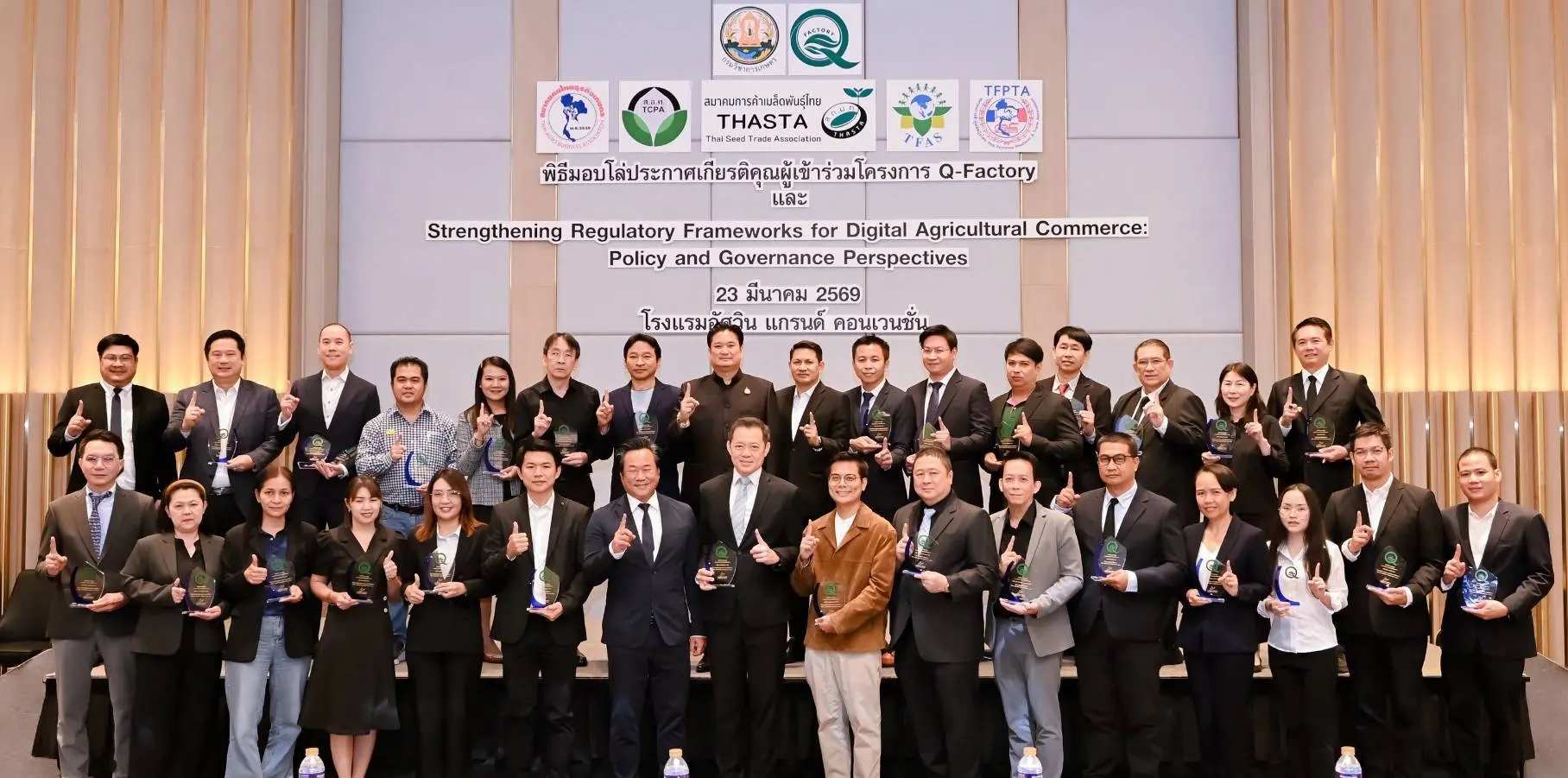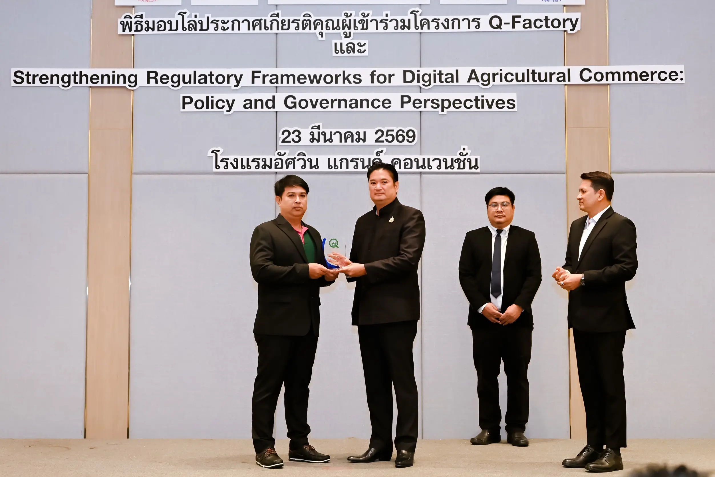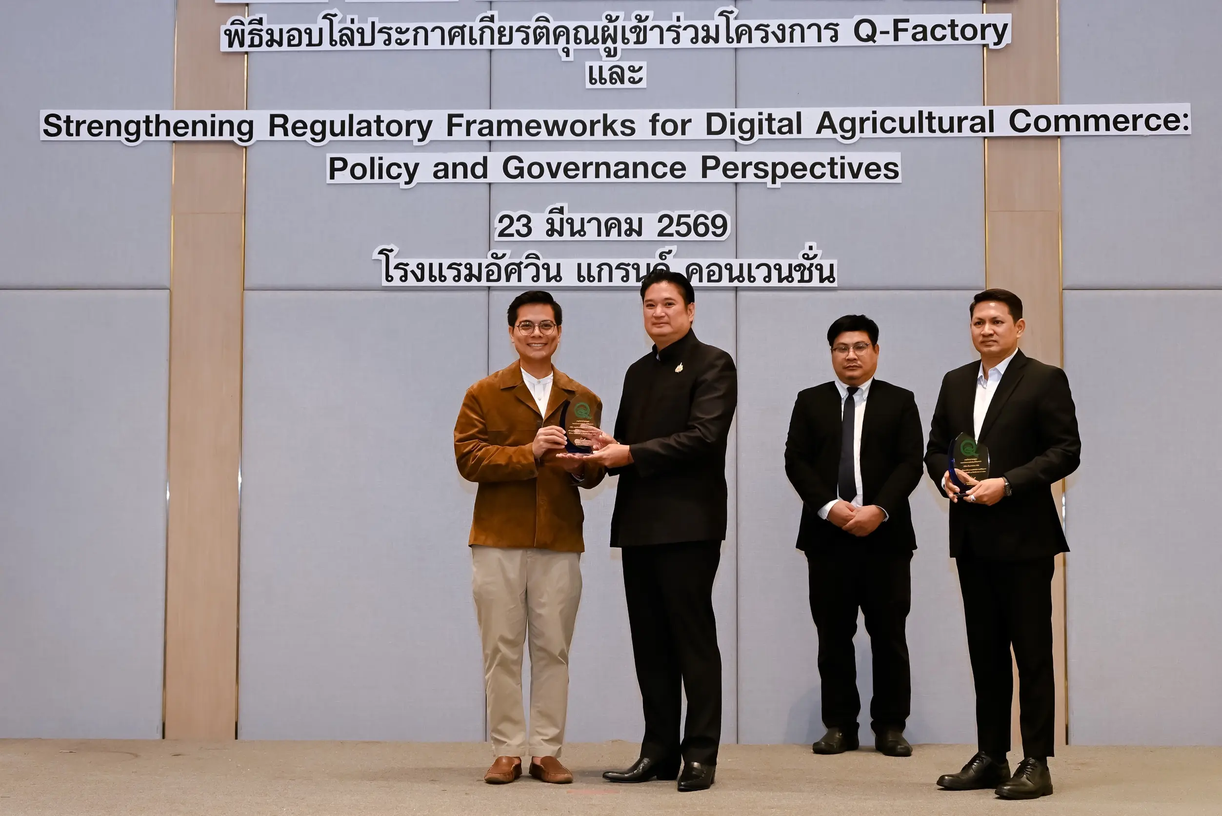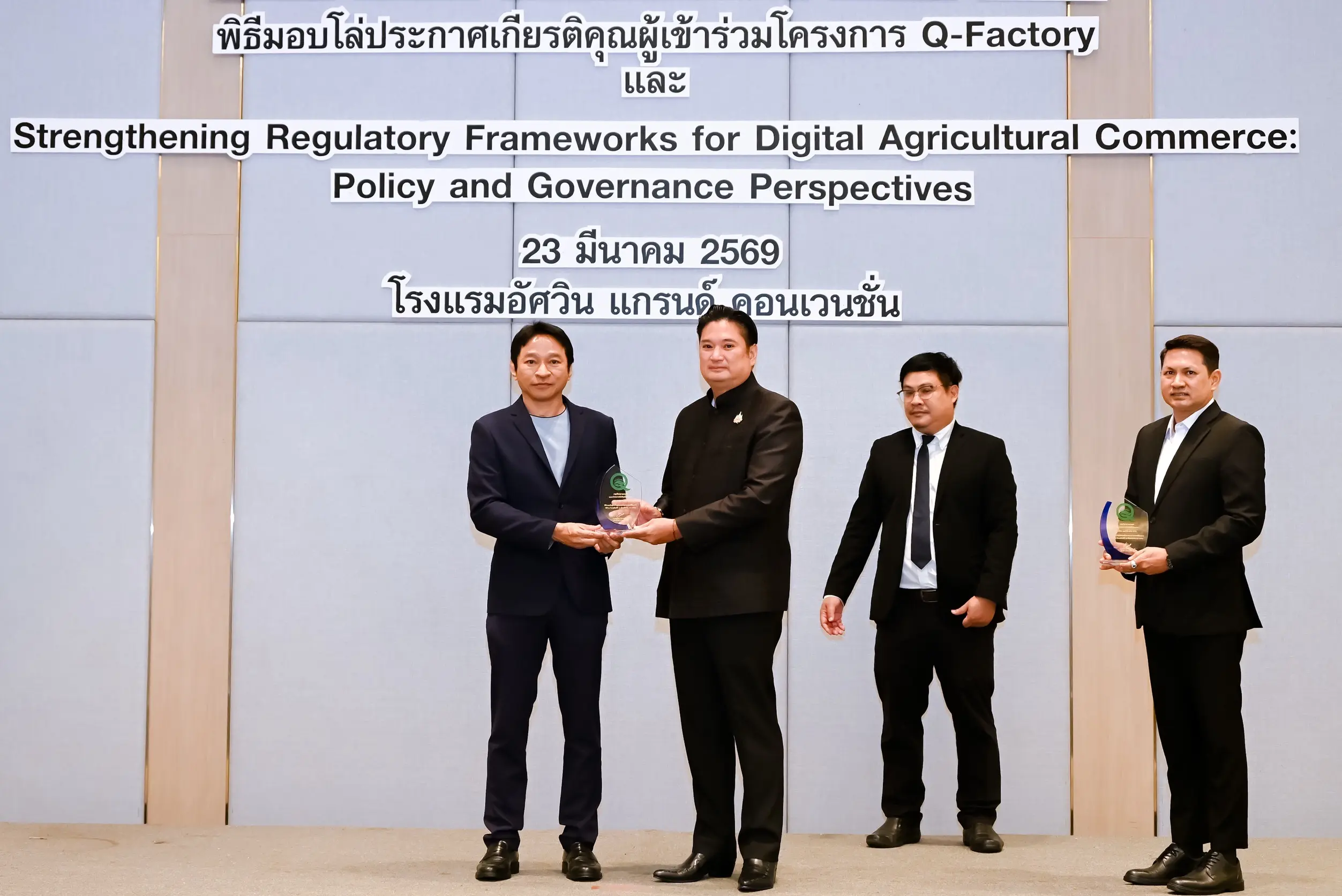 เมื่อวันที่ 23 มีนาคม 2569 นายรพีภัทร์ จันทรศรีวงศ์ อธิบดีกรมวิชาการเกษตร เป็นประธานเปิดการเสวนาเรื่อง “การเสริมสร้างกรอบการกำกับดูแลการค้าสินค้าเกษตรดิจิทัล : มุมมองเชิงนโยบายและหลักธรรมาภิบาล” พร้อมมอบโล่ประกาศเกียรติคุณแก่ผู้ประกอบการในโครงการ Q-FACTORY ประจำปี 2568 ณ โรงแรมอัศวิน แกรนด์ คอนเวนชั่น กรุงเทพมหานคร โดยมีผู้บริหารจากหน่วยงานภาครัฐ ภาคเอกชน และภาคีเครือข่ายที่เกี่ยวข้องเข้าร่วมอย่างคับคั่ง