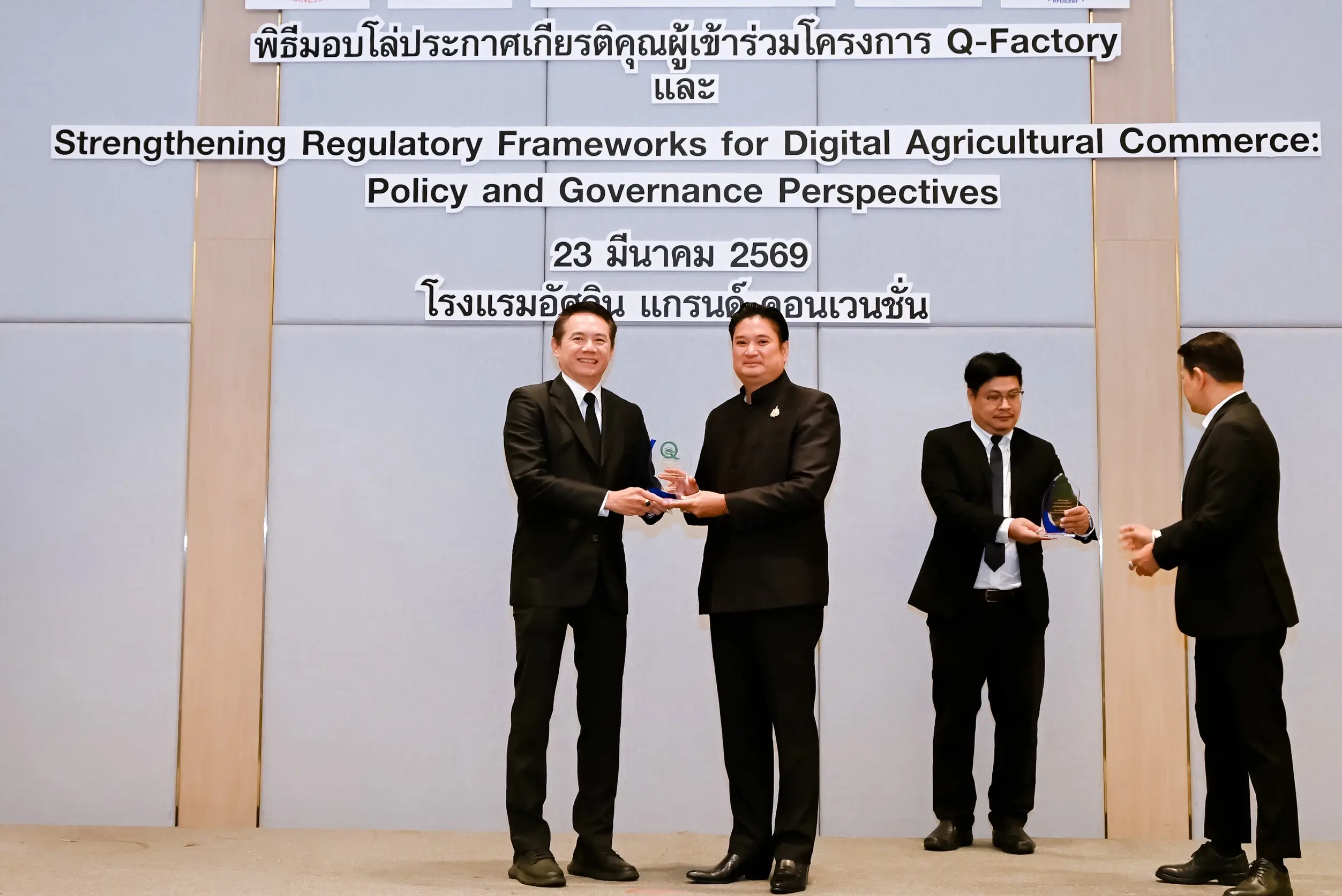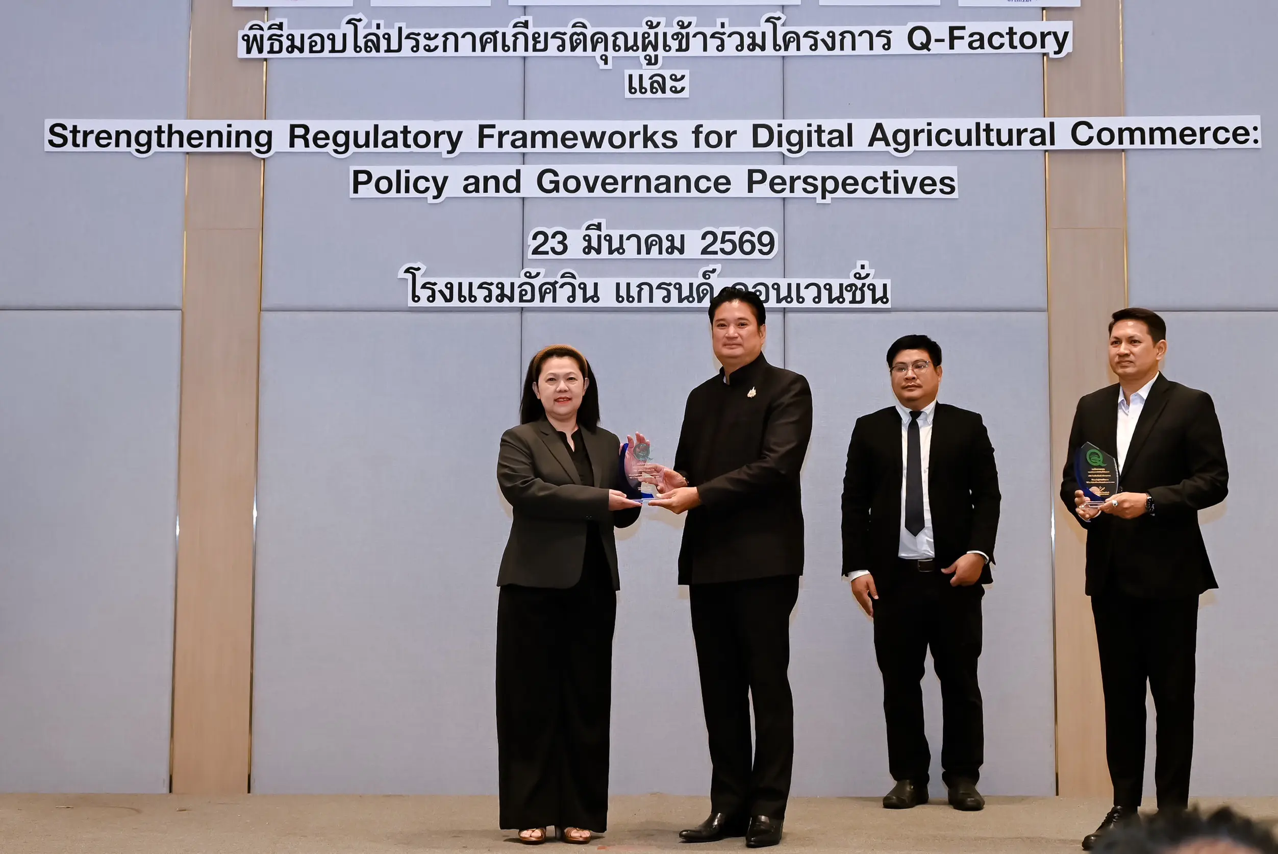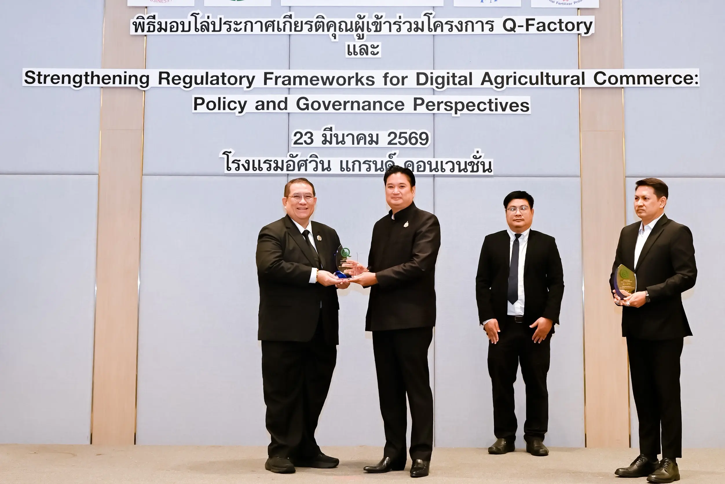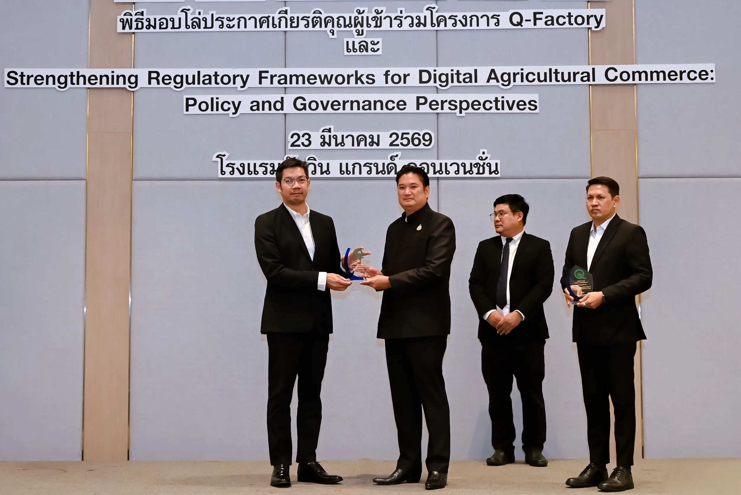 เมื่อวันที่ 23 มีนาคม 2569 นายรพีภัทร์ จันทรศรีวงศ์ อธิบดีกรมวิชาการเกษตร เป็นประธานเปิดการเสวนาเรื่อง “การเสริมสร้างกรอบการกำกับดูแลการค้าสินค้าเกษตรดิจิทัล : มุมมองเชิงนโยบายและหลักธรรมาภิบาล” พร้อมมอบโล่ประกาศเกียรติคุณแก่ผู้ประกอบการในโครงการ Q-FACTORY ประจำปี 2568 ณ โรงแรมอัศวิน แกรนด์ คอนเวนชั่น กรุงเทพมหานคร โดยมีผู้บริหารจากหน่วยงานภาครัฐ ภาคเอกชน และภาคีเครือข่ายที่เกี่ยวข้องเข้าร่วมอย่างคับคั่ง