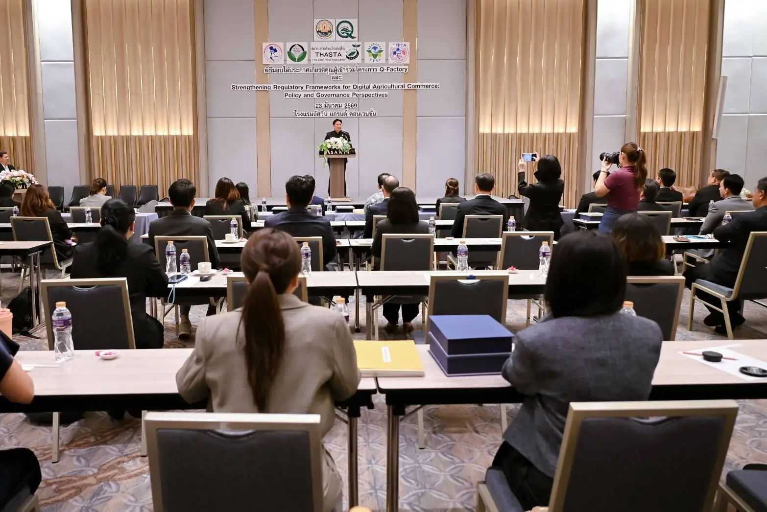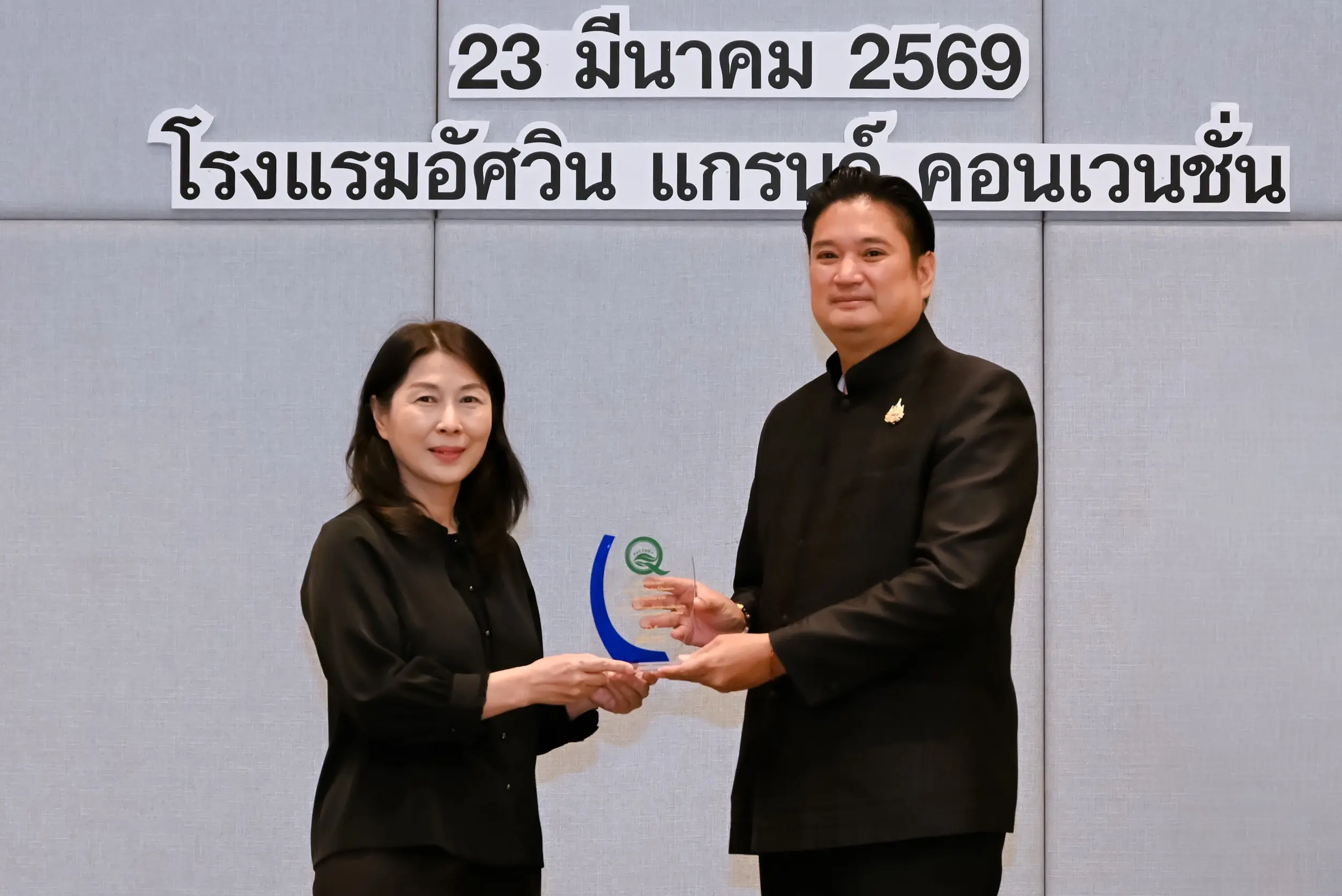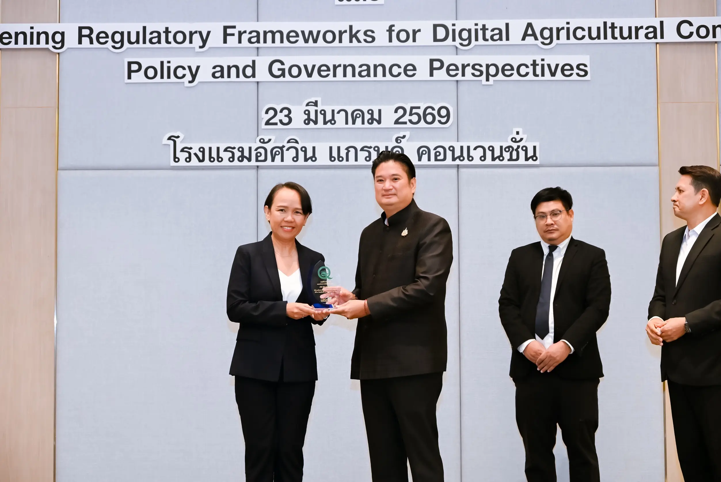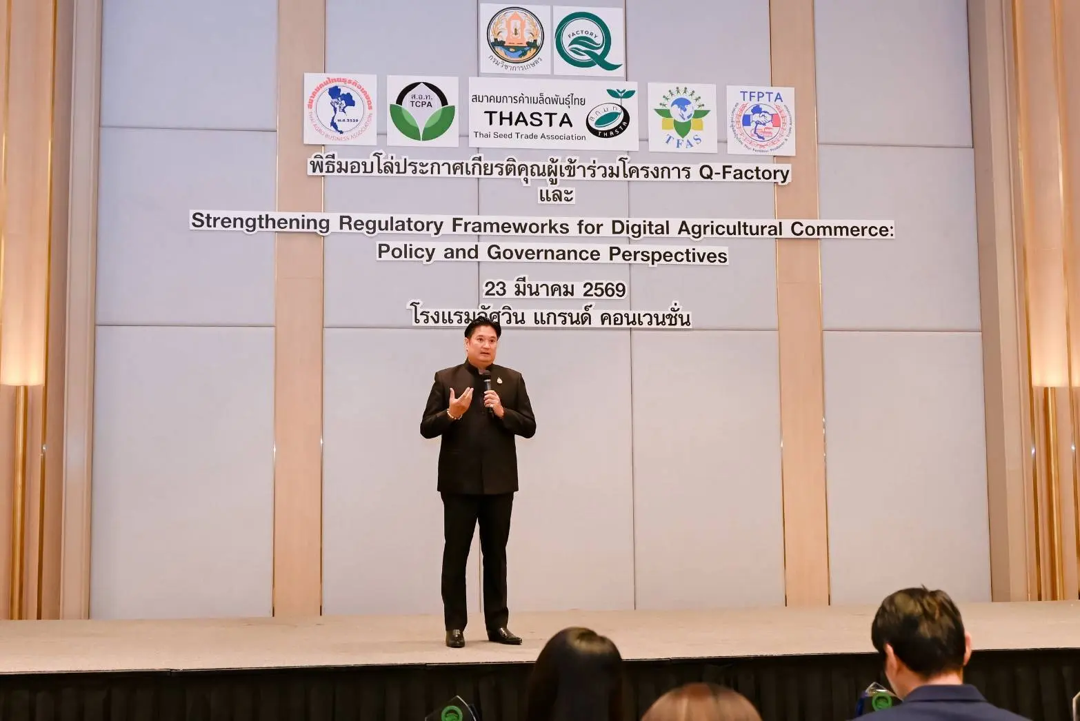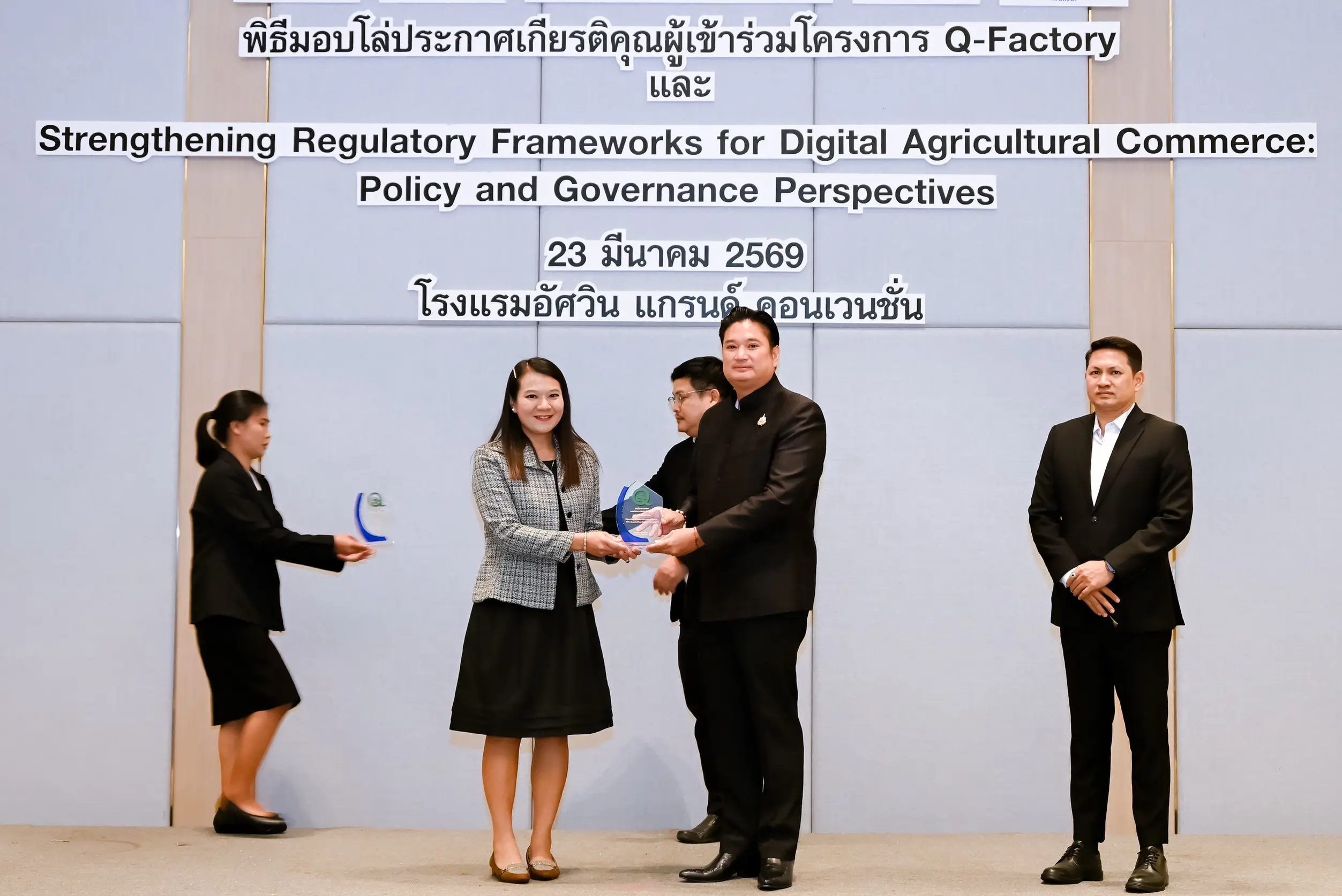 เมื่อวันที่ 23 มีนาคม 2569 นายรพีภัทร์ จันทรศรีวงศ์ อธิบดีกรมวิชาการเกษตร เป็นประธานเปิดการเสวนาเรื่อง “การเสริมสร้างกรอบการกำกับดูแลการค้าสินค้าเกษตรดิจิทัล : มุมมองเชิงนโยบายและหลักธรรมาภิบาล” พร้อมมอบโล่ประกาศเกียรติคุณแก่ผู้ประกอบการในโครงการ Q-FACTORY ประจำปี 2568 ณ โรงแรมอัศวิน แกรนด์ คอนเวนชั่น กรุงเทพมหานคร โดยมีผู้บริหารจากหน่วยงานภาครัฐ ภาคเอกชน และภาคีเครือข่ายที่เกี่ยวข้องเข้าร่วมอย่างคับคั่ง